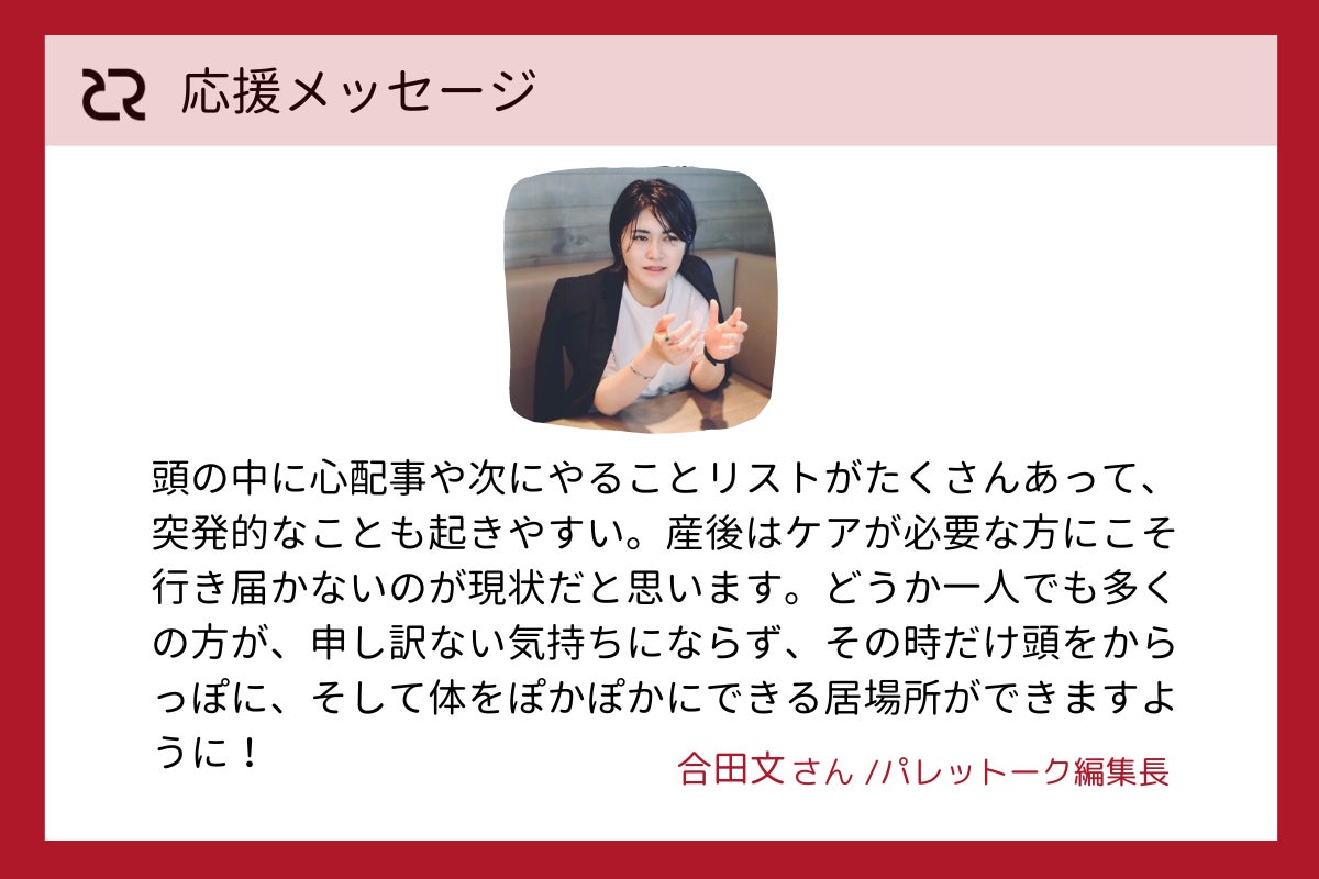 『 頭の中に心配事や次にやることリストがたくさんあって、突発的なことも起きやすい。産後はケアが必要な方にこそ行き届かないのが現状だと思います。どうか一人でも多くの方が、申し訳ない気持ちにならず、その時だけ頭をからっぽに、そして体をぽかぽかにできる居場所ができますように! 』