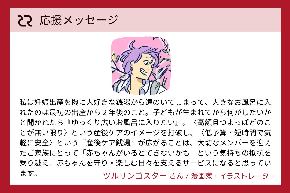 みなさん、こんにちは!Rineスタッフです。応援メッセージをご紹介させていただきます!『 私は妊娠出産を機に大好きな銭湯から遠のいてしまって、大きなお風呂に入れたのは出産から2年後のこと。子どもが生まれてから何がしたいのかと聞かれたら「ゆっくり広いお風呂に入りたい」。〈高額且つよっぽどのことが無い限り〉という産後ケアのイメージを打破し、〈低予算・短期間で気軽に安全〉という『産後ケア銭湯』が広がることは、大切なメンバーを迎えた家族にとって「赤ちゃんがいるとできないかも」という気持ちの抵抗を乗り越え、赤ちゃんを守り・楽しむ日々を支えるサービスになると思っています。』--- ツルリンゴスター様 / 漫画家・イラストレーターHP https://tsururingostar.com/応援メッセージありがとうございます!より多くの保護者に少しでも休息の時間をもっていただくために、サービスの拡大を実現することが私たちの使命です。株式会社Rine スタッフ