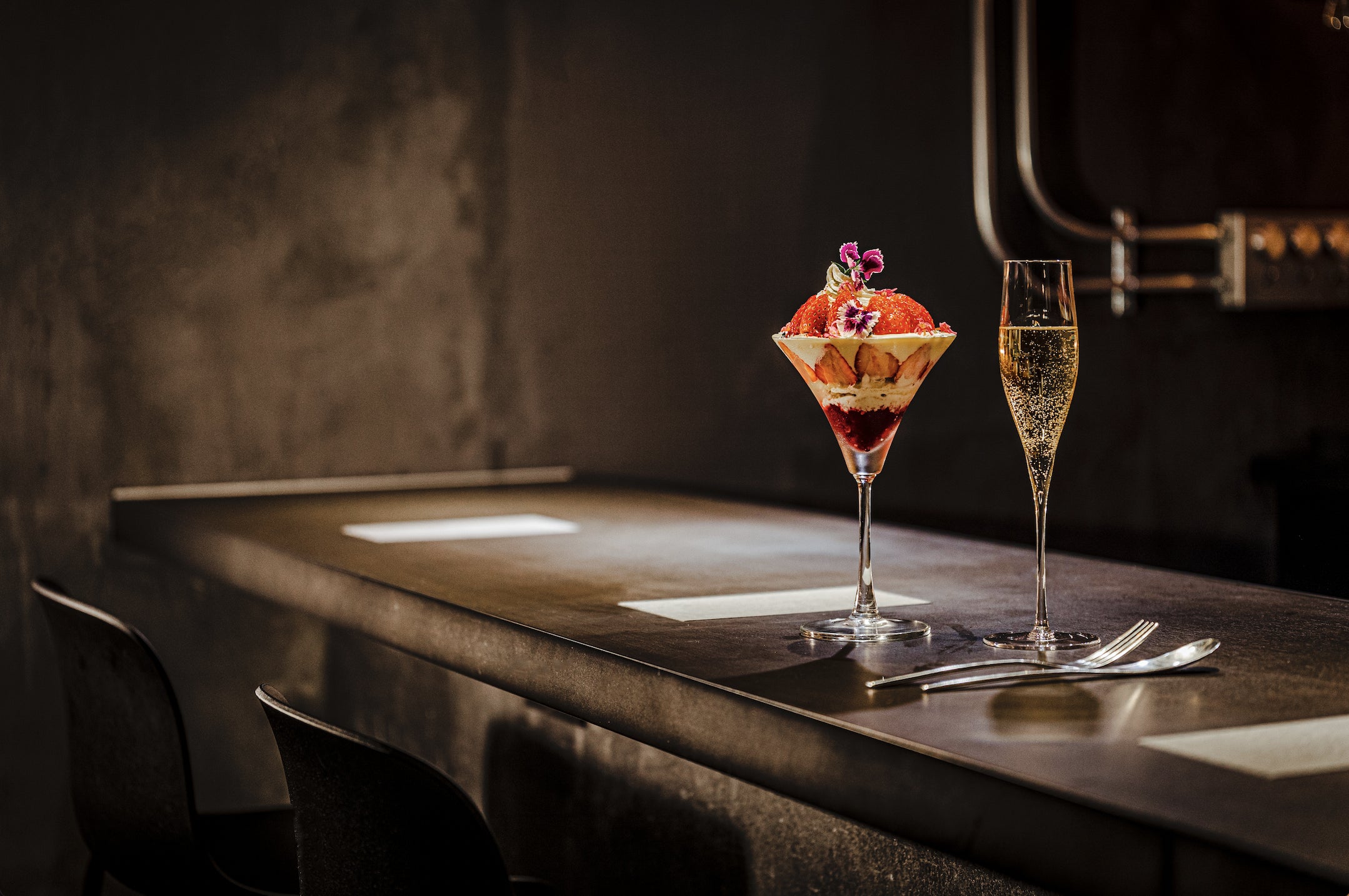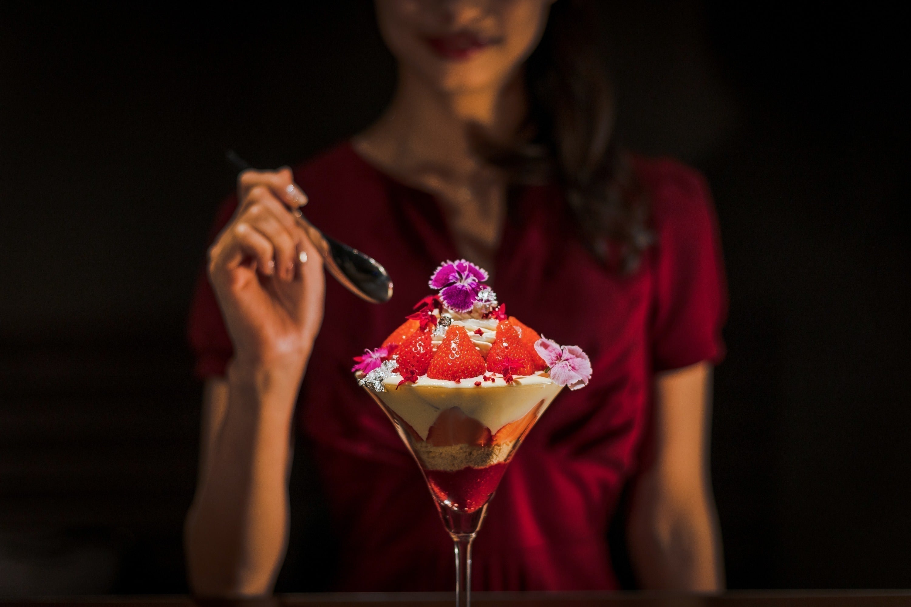 グラスの形状からスプーンの幅、運ばれるひとくちのバランスを1ミリ、1グラム単位まで計算することで、食べ進めていく楽しみがデザートに奥深さを与え、パフェをまるでアートに感じさせます。
