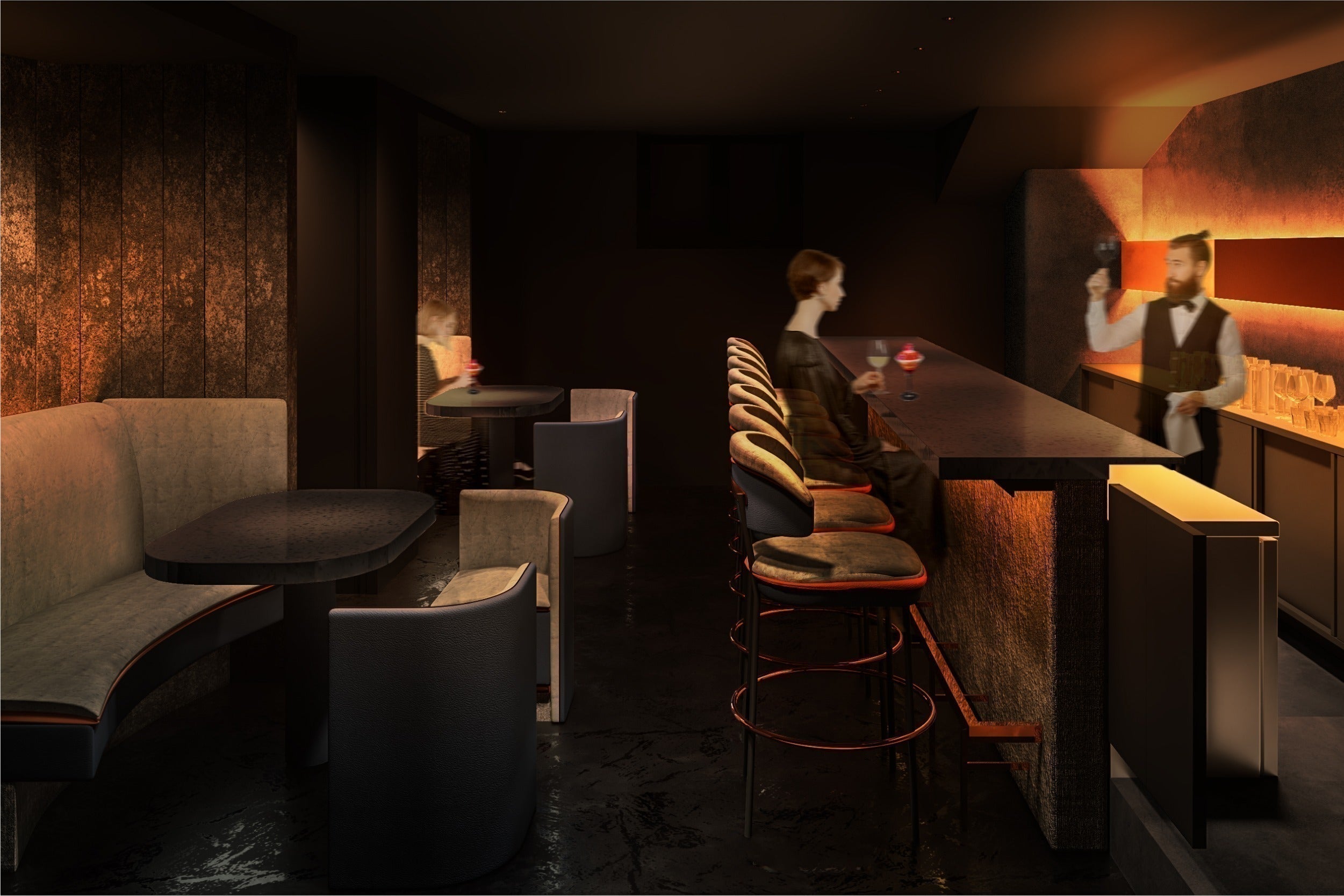 すすきの駅から徒歩3分。賑やかな繁華街を抜け、扉を開けると、禁酒法時代の隠れ家バー「スピークイージー」を思わせるヴィンテージとモダンが調和した重厚な雰囲気の空間が広がります。カッパーカラーの銅板が印象的なバーカウンターを正面に、ゆったりとしたソファ席やVIPルームも完備しています。