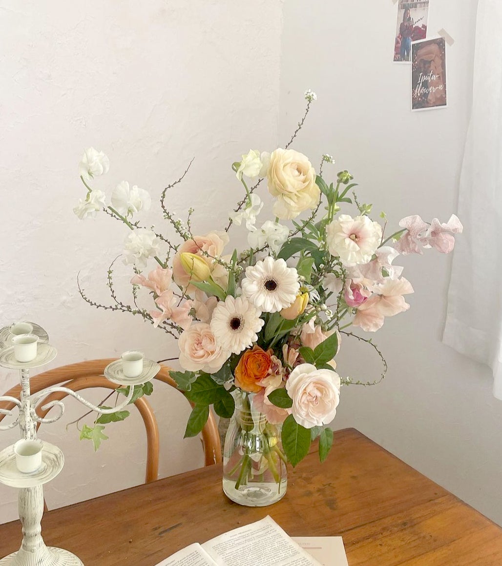 「淡い色合い」で「繊細」、「統一感」があるのが韓国アレンジの特徴です。それでいて、お花ひとつ一つがピョンピョン飛び出したりしていて、ビックリ箱を開けた時のような楽しさもあります。