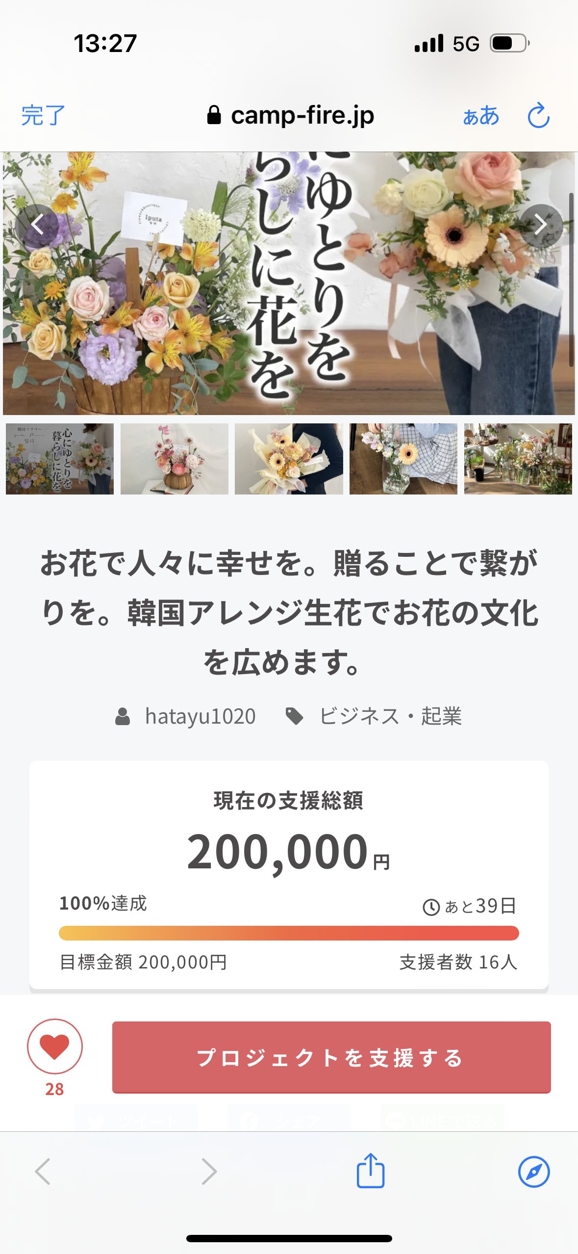 2023/09/22 23:43皆様こんばんは◡̈*夜分に失礼いたします。この度はファーストゴールの20万円という目標を見事達成することができました!!ドキドキのスタートでしたが、いぷたは素敵な方達に支えられているんだなということを再認識いたしました。皆様のご支援あっての目標達成でございます。本当に本当にありがとうございます。ネクストゴールは"50万円"を目標に励んでいきたいと思います!!いぷたのお花が沢山の方の目に留まり、心を動かしますように。この度は誠にありがとうございました(´◡`๑)引き続きいぷたのクラウドファンディングにお付き合い頂けますと幸いでございます◡̈* もっと見る