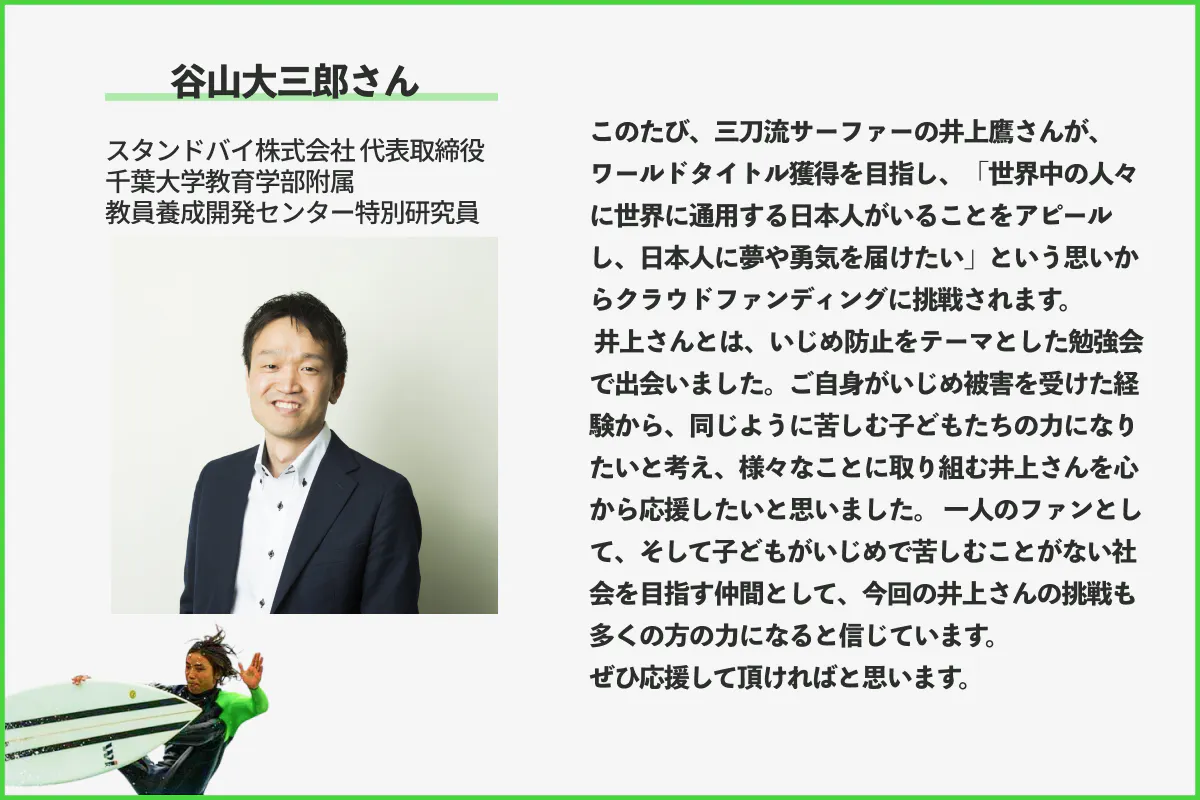 ですから、僕を通してそんな人を一人でも多く助けるために、僕がサーフィン活動を続けるためのこのプロジェクトにご協力を頂ければと思います。