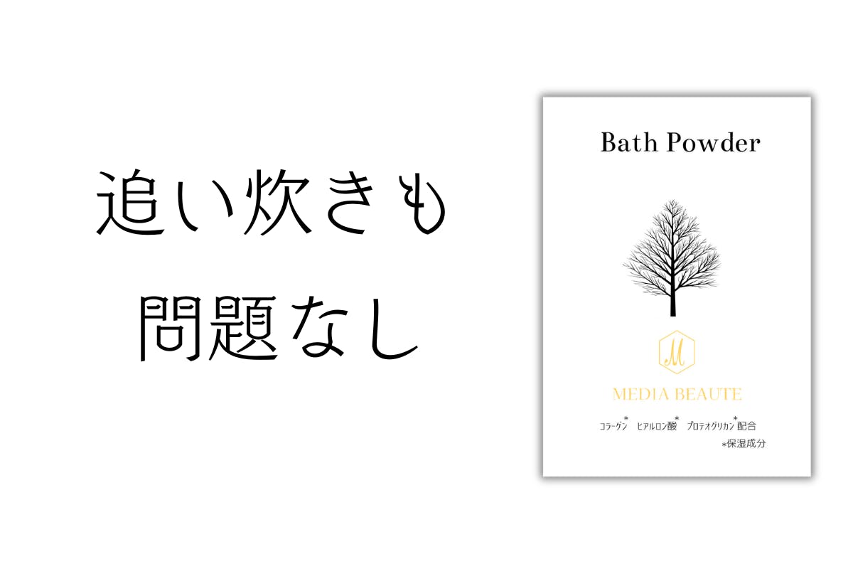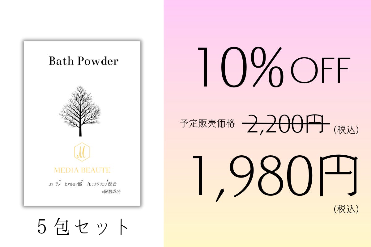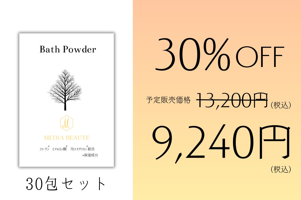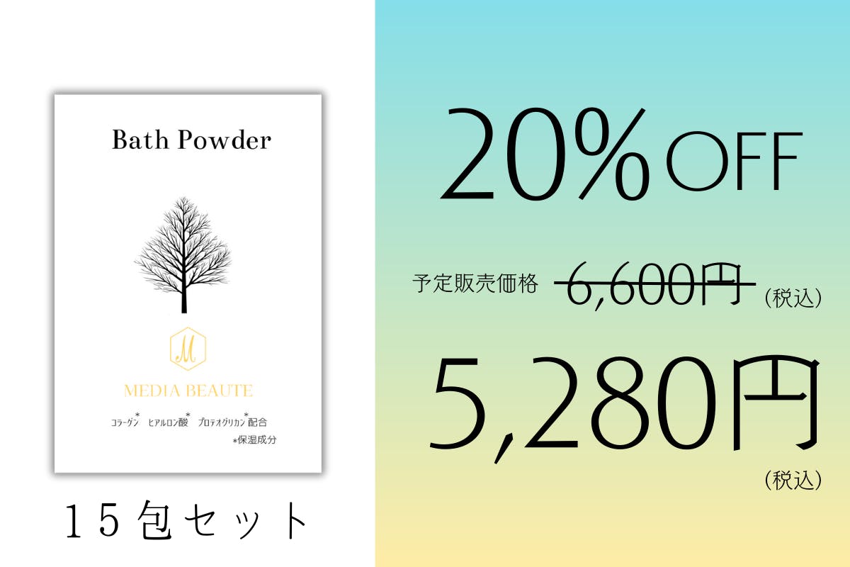 初めまして。MEDIA BEAUTEです。美容一筋で今年40周年を記念して、新たなコスメラインを立ち上げる事になりました。新製品の全身美容バスパウダーは、コラーゲン・ヒアルロン酸・プロテオグリカン配合となり、入浴時に入れるだけで美しさの高まりを実感して頂けると思います。香りは、ひのきとなっており、自律神経活動を鎮静化し、リラックスして頂けます。美容一筋40年のMEDIA BEAUTEの自信の逸品です。