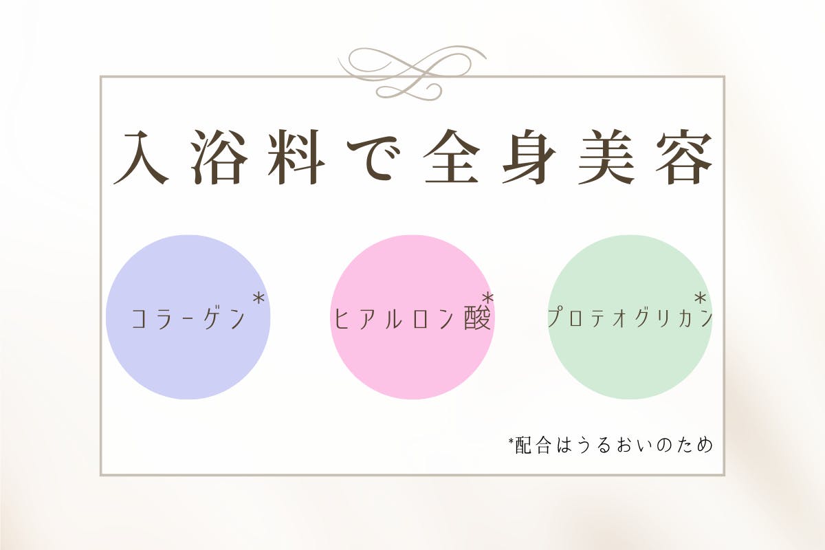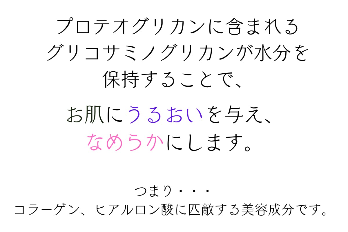 硫酸Na、炭酸水素Na、酸化チタン、香料、加水分解コラーゲン、ヒアルロン酸Na、水溶性プロテオグリカン、ポリアクリル酸Na、ポリアクリル酸、ベントナイト、ステアリン酸PEG-75、BG、水