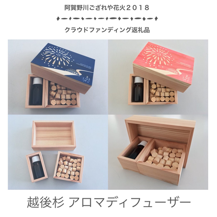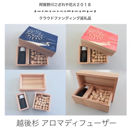 2018/07/28 15:45“ござれや地域”の魅力発信通信 Vol.⑪\越後杉のアロマディフューザー/ クラウドファンディングへご協力いただきありがとうございます。 本プロジェクトも残り4日となってきました! 多くの皆様のご支援をいただき、目標金額達成まであと少し(>_<) 最後の最後まで、Completeできるよう頑張りたいと思います!! さて、活動報告を通じて、返礼品としてご協力いただきましたお礼品をご紹介していくシリーズ。 『“ござれや地域”の魅力発信通信』Vol.⑪をお届けいたします! 勝手に設定した“ござれや地域”の魅力発信に繋がればと願い、リターン商品としてご提供いただいたお礼品をご紹介するシリーズも終盤となって参りました。 今回は、新潟市東区を拠点に事業を展開されている方“畑山建築”様を中心にクラウドファンディングのためだけに特別制作した、\越後杉のアロマディフューザー/をご紹介いたします。 箱は、新潟市東区向陽で事業を展開されている「(有)畑山建築」様が越後杉で制作。 阿賀野川に打揚がる花火をデザイン。 デザイン制作と表面へのUVプリンターを「㈱ISTCRUE(イストクルー)」様より印刷をしていただきました。 色はネイビーとピンクの2種類を今回のためだけにご用意いたしました。 ※ご支援いただく際、ネイビーかピンクのいずれかを必ずご記載ください。 大きさもコンパクトです。インテリアとしてお部屋のワンポイントにしてもとてもおしゃれで可愛いデザインとなっております。 中身のアロマオイルも今回のござれや花火オリジナルブレンドの香りです!香りを楽しみながら、来年の花火大会を楽しみにして頂けると嬉しいです! ■越後杉アロマディフューザー大きさ:縦110mm×横75mm×高さ35mmアロマは5ml※付属のアロマオイルが無くなりましたら、市販のアロマオイルでお楽しみください!(^^)! ぜひ花火女子が創作する打揚げ費用へのご支援とともにいかがでしょう!(^^)! 皆さまご支援の程、どうぞよろしくお願いいたします!! もっと見る