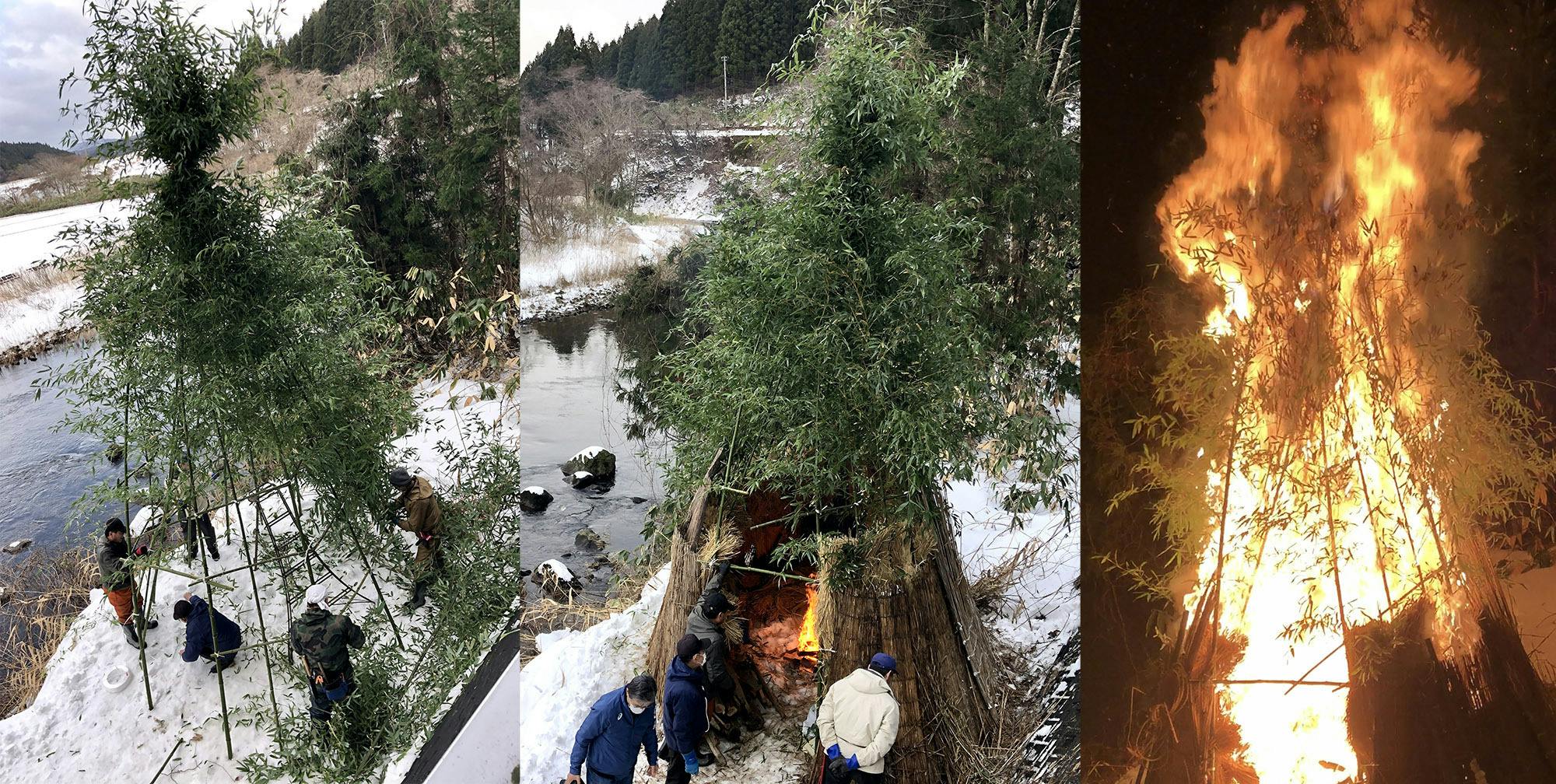 ▲竹や藁の自然素材でつくる八幡地域の伝承行事の小屋「さんど小屋」づくり。2日目の最後には火を入れます。