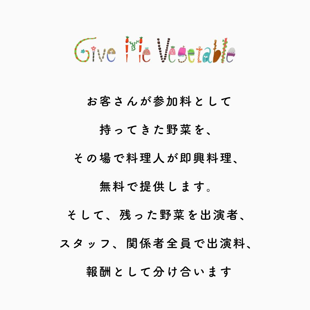 入場料が野菜の食+音楽イベント。2010年より、これまでに全国各地で70回以上開催している。お客さんが参加料として持ってきた野菜を、その場で料理人が即興料理、無料で提供します。そして、残った野菜を出演者、スタッフ、関係者全員で出演料、報酬として分け合います。2019年6月には初の海外開催となるギブミーベジタブル in 台湾を開催し、300人以上の動員を集める。現在、ギブミーベジタブルを自由に開催出来るよう、ホームページ上にてギブミーベジタブルの開催方法を公開し、オープンソース化している。