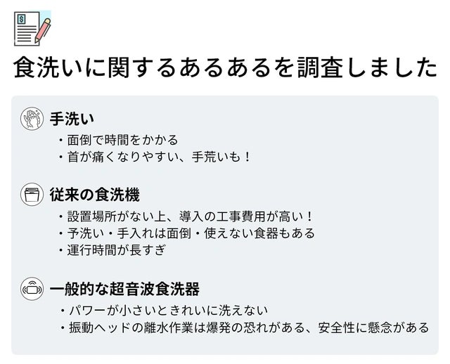 皆様の生活をより快適にする為だけでなく、「料理が楽しくなる」、「楽々洗浄」という新しい感動的な体験を提供したいということを目指し、ユーザー様たちのニーズに応じ、超音波食洗器を改良し、「SoniClean」の開発を完成しました。