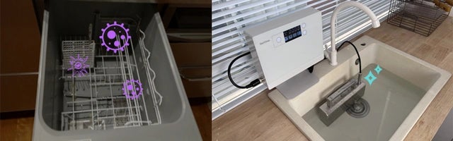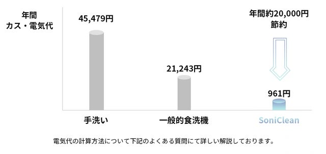 「SoniClean」は1回あたりの電気代が約1.31円。1日2回洗浄すると仮定し、1円×2回×365日=961円一般の食洗器と比べると、年間で14,454円以上節約できます。
