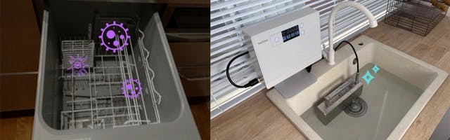 通常の食洗機や手洗いでは届かない角や隙間にも入り込み、空気の衝撃波でこれらの箇所を徹底的に洗浄できます。