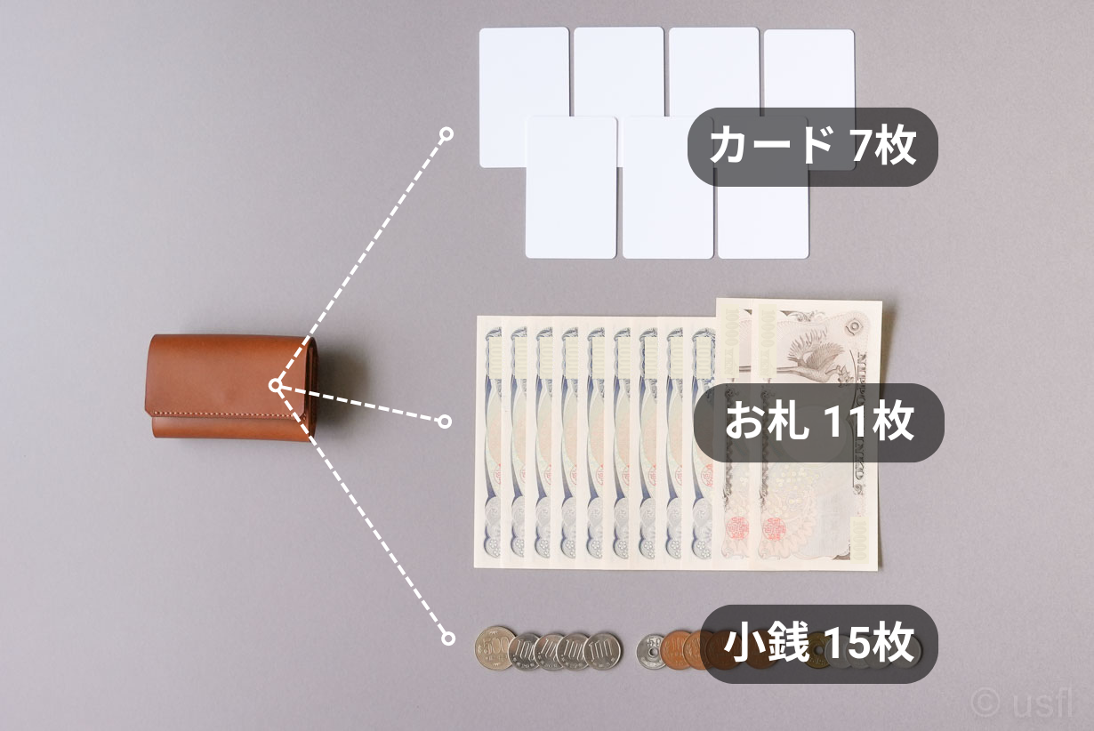 カード 7枚、お札 11枚、小銭 15枚