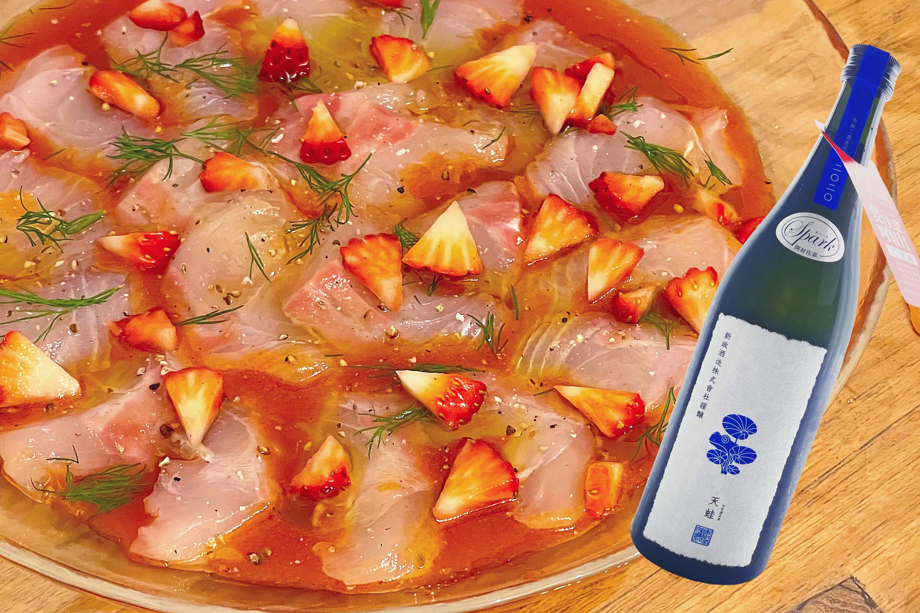 ※お酒の「酸」に注目したペアリング。新政酒造の「天蛙」の持つ白ブドウや和梨を想わせるフルーティーな酸にイチゴとトマトソースの持つ酸味がベストマッチ。