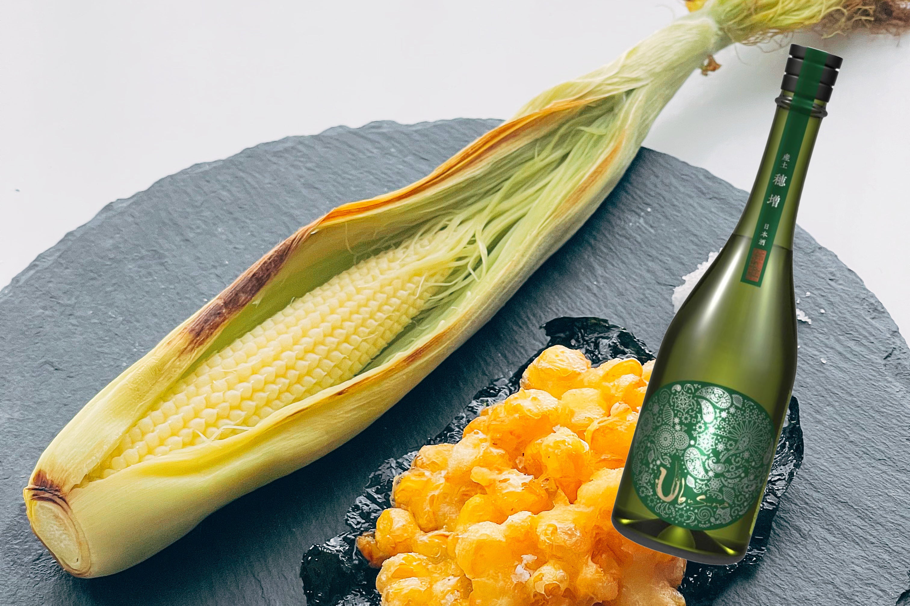 ※木桶由来の杉の香りとお酒自身の若草のようなニュアンスを持つ花の香酒造の「産土穂増木桶」には青々とした香りのヤングコーンをペアリング。