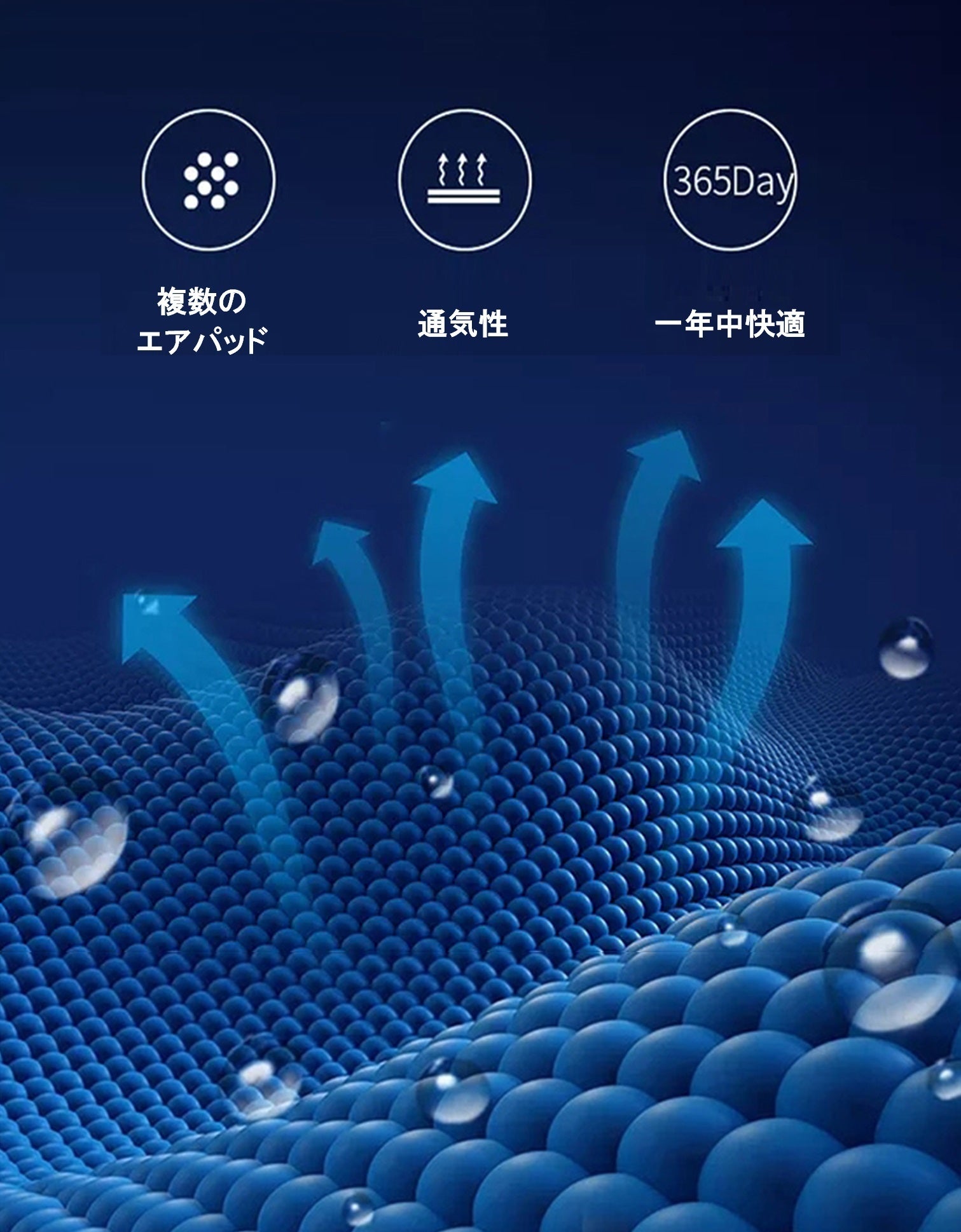 エアパッドとエアパッドの隙間を空気が循環する為、夏場でも高い通気性を保ちます。高級ソファにも使われるTPUライクラ材を使い、撥水性も抜群でいつも快適な睡眠環境を作ります!