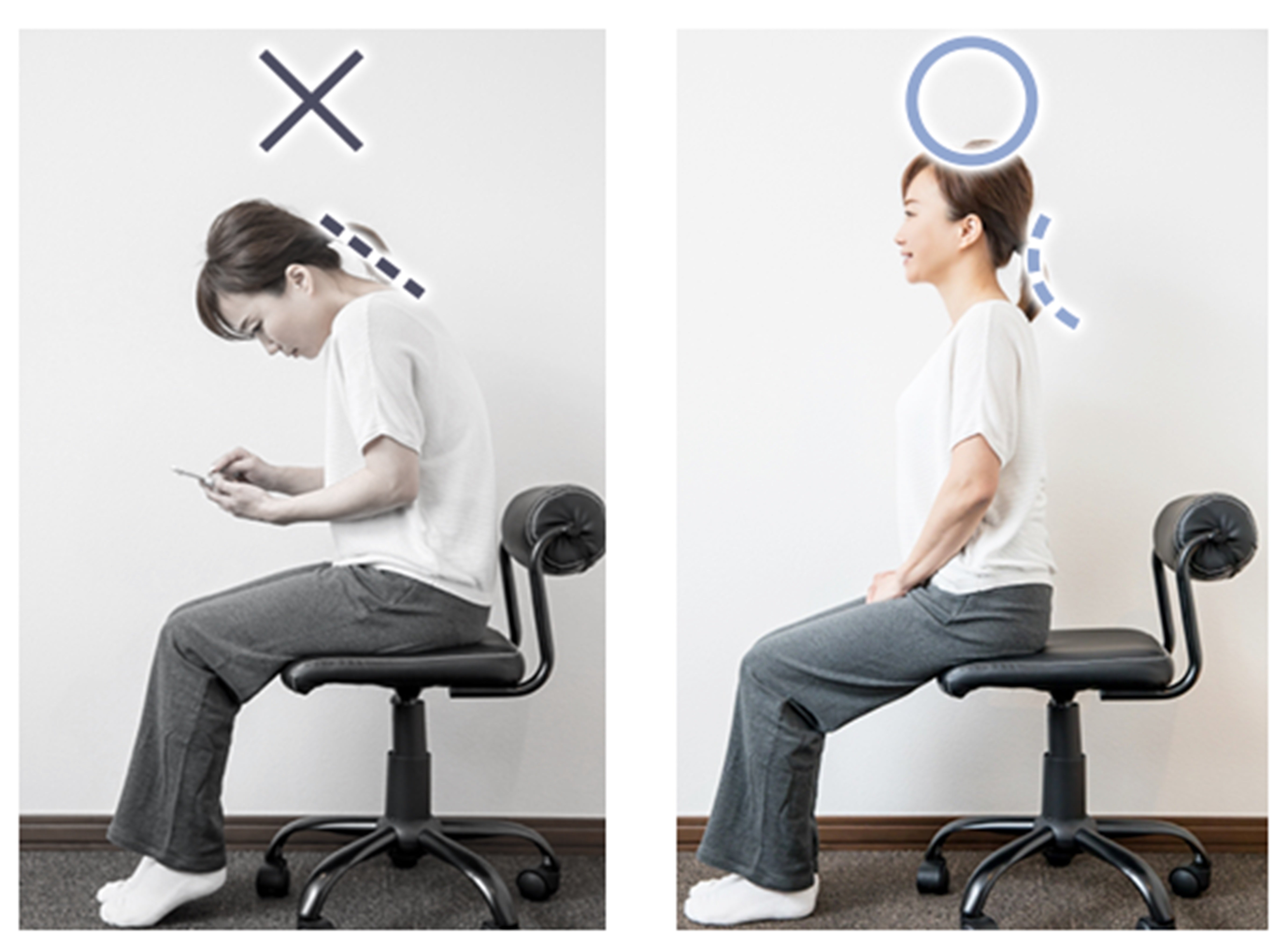 正常な首の骨は「ゆるやかにカーブ」しています。まっすぐ(ストレートネック)や逆に曲がっていると脊髄に負担がかかり構造的に不利になります。スマホやパソコン操作によってこの状態が続くと、日常の呼吸の気道も確保しづらくなり体に様々な不調を与えます。