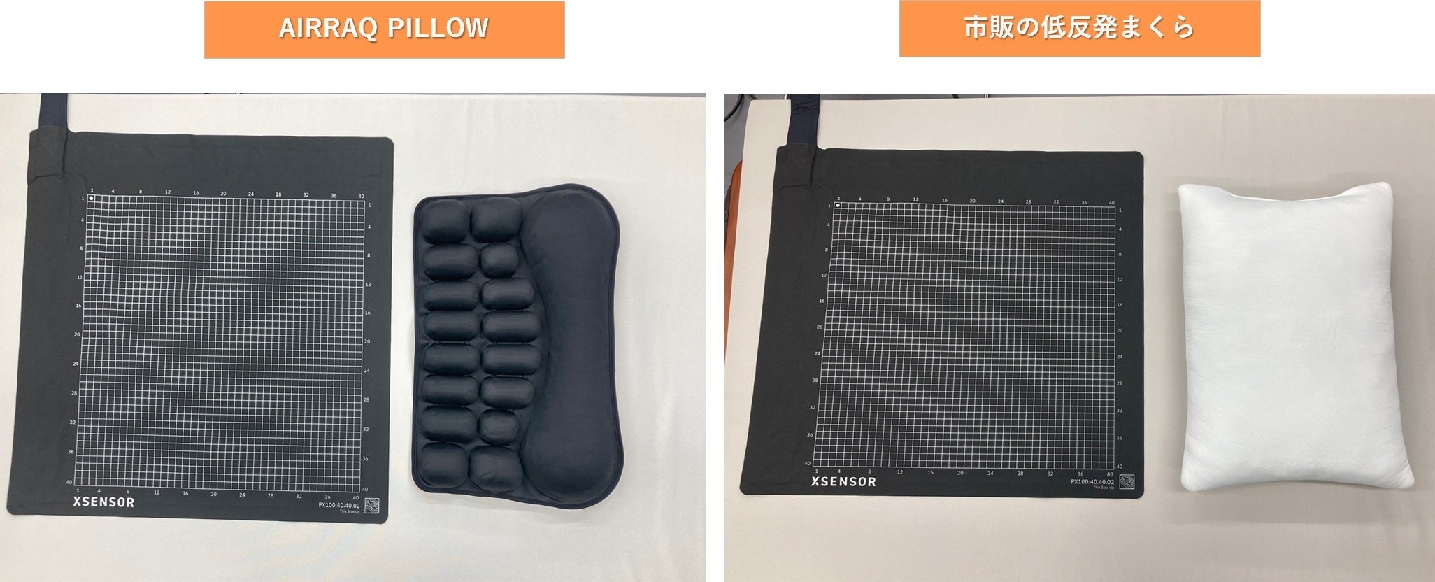 実際に圧力測定したところ市販の低反発まくらを使用した場合のピーク圧⼒(13.91kpa)に対し、AIRRAQ PILLOW(エアラクピロー)を使用するとピーク圧⼒(6.6kPa)が53%減圧しました。
