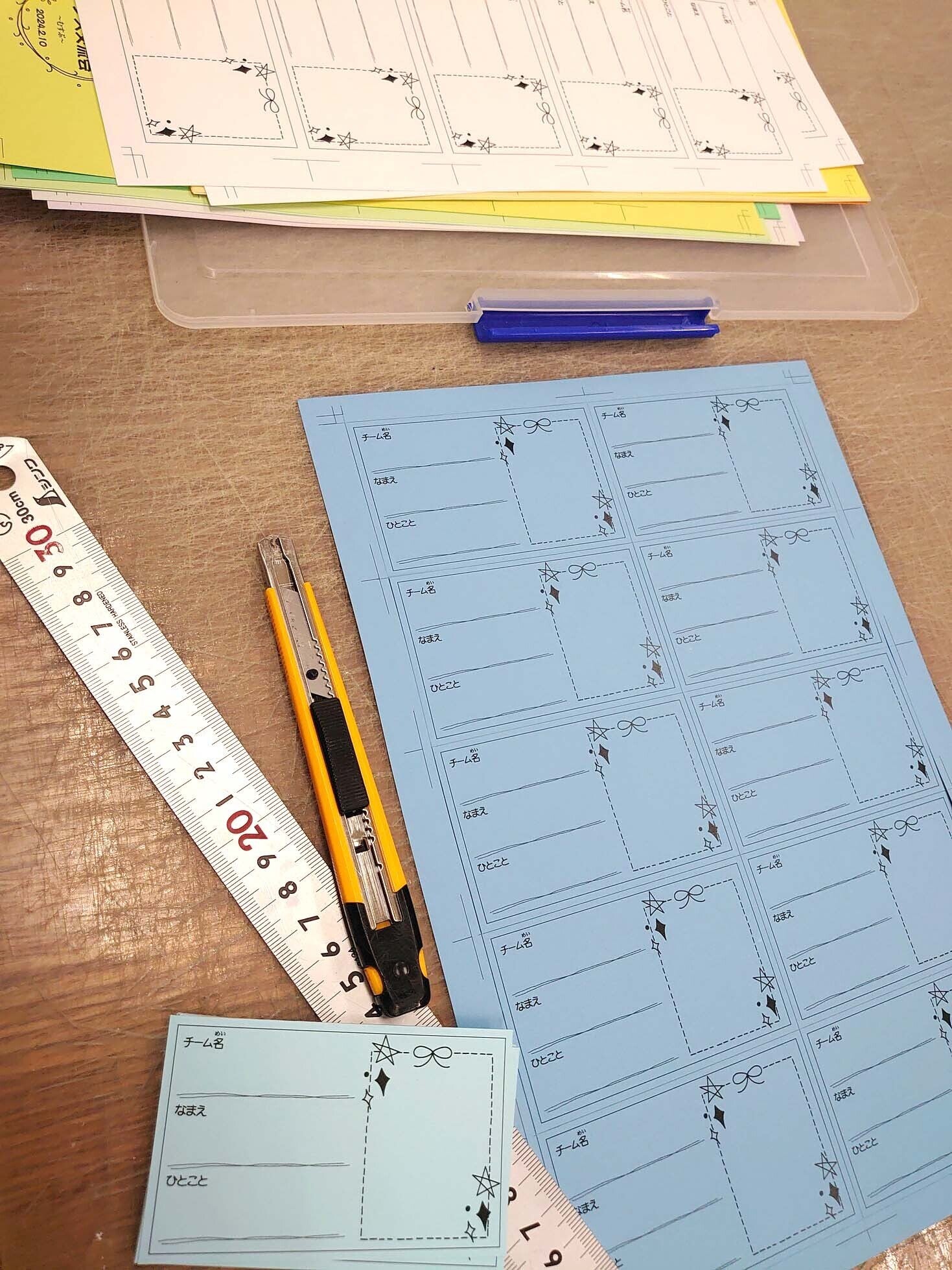イベント内で行う名刺交換会用の名刺を作成しました。薄い画用紙にコピーして一枚一枚カッターで切っております。21色あるので子供達はどれが好みでしょうか。少しでも早く2チームのメンバーが仲良くなれればよいなぁしかし…手が腱鞘炎になりそうです^^;