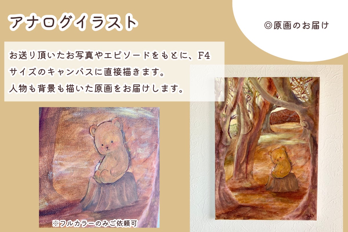 あなたとご家族、お友達やパートナーなど、大切な人との特別な思い出のお写真やエピソードをもとに世界に一つだけの絵を描きます。