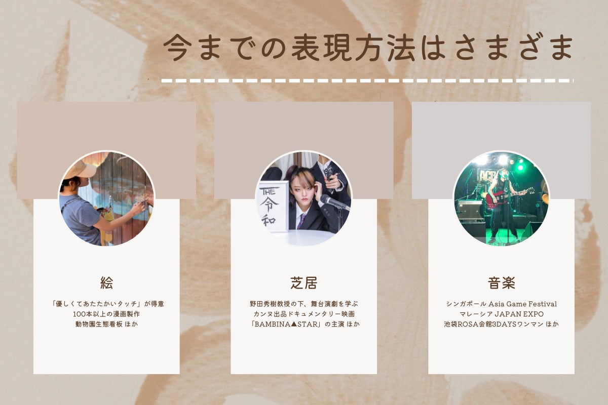 フリーランスのイラストレーターや、映画、舞台役者、ギターリスト、歌手など、1つの形にとらわれず、様々な形で表現活動してきました。