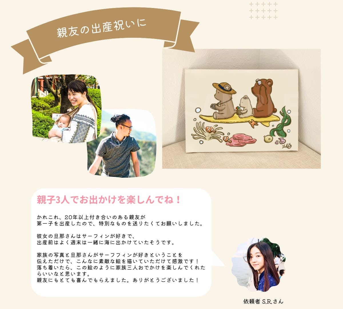 あなたとご家族、お友達やパートナーなど、大切な人との特別な思い出のお写真やエピソードをもとに世界に一つだけの絵を描きます。