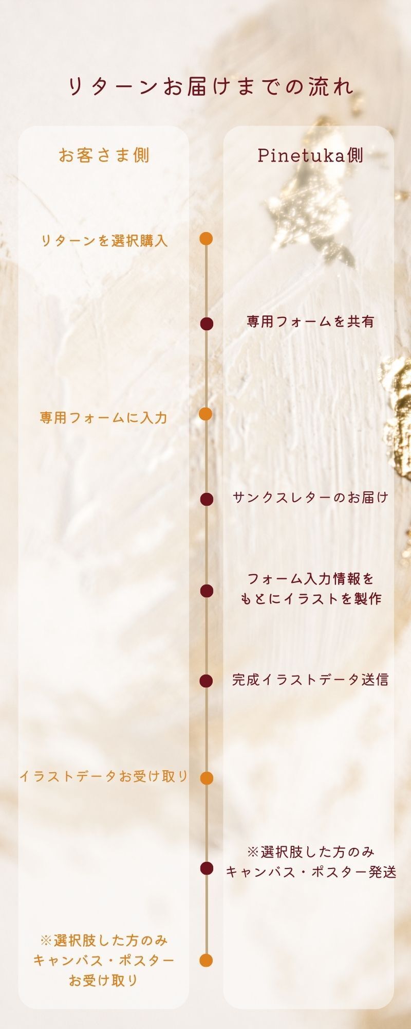 ご購入後、ご入力いただいたメールアドレス宛に、該当リターンを製作するためのアンケートフォームURLをお送りさせて頂きます。ご購入後から10日間、メールまたはクラウドファンディングサイト上メッセージ機能にてアンケートフォームURLをお受け取りできない場合は、迷惑フォルダに分類されていないか今一度ご確認いただいた上、必要に応じてお問い合わせください。