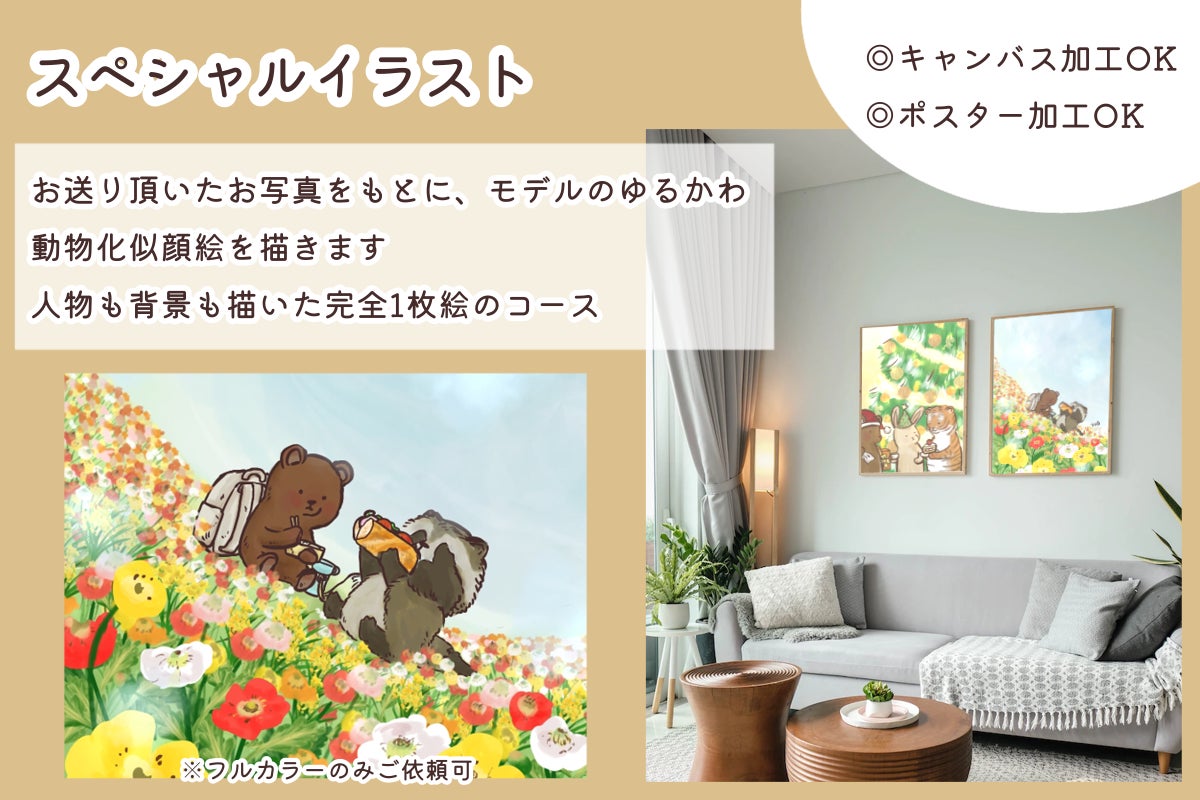 お写真をお送りいただくと、人物をゆるかわ動物化したイラストを描きます!データ納品に追加し、F4サイズのキャンバスや、A2サイズのポスターでのお届けも可能です。存在感のあるインテリアや特別な記念日のプレゼントにオススメです!