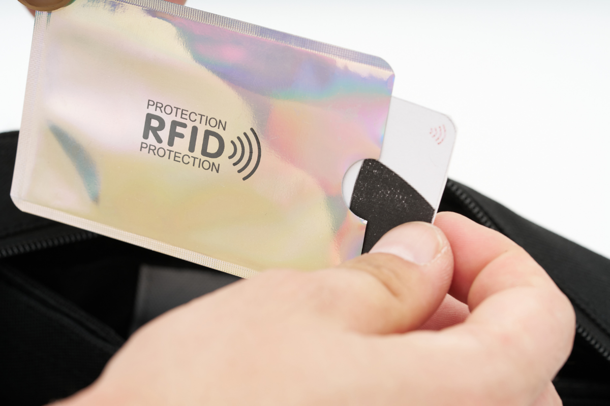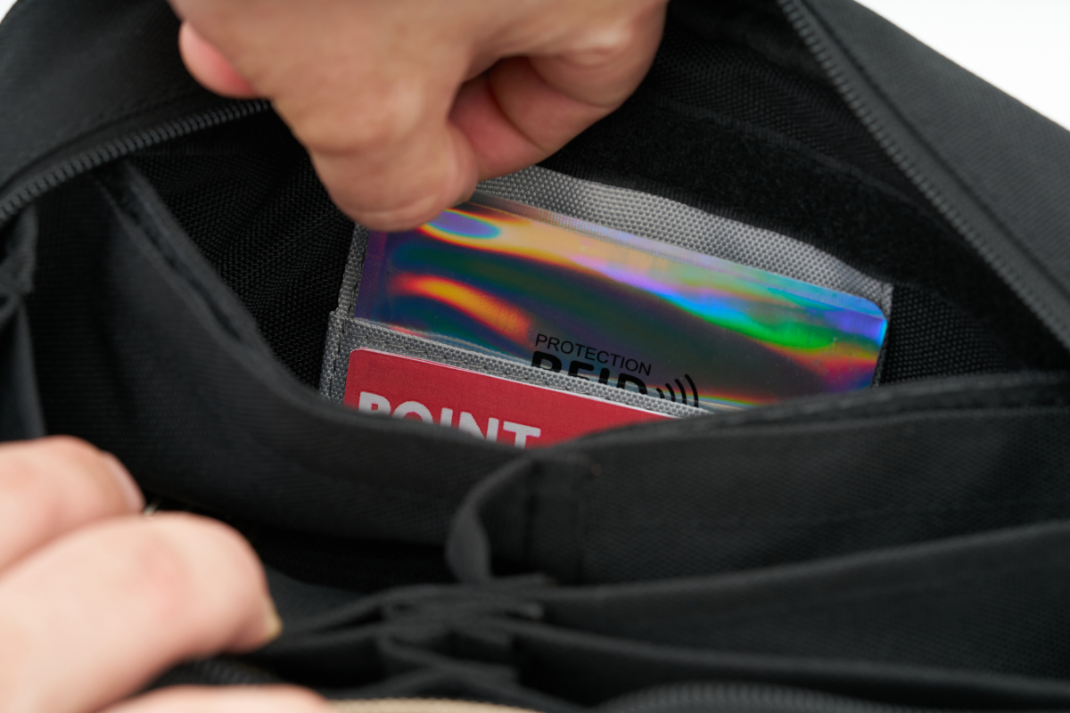ポーチの外側に「マジックテープ式のICカードポケット」もありますが、クレジットカードなど大事なカードを守るための「スキミング防止専用ケース」も付属しています。