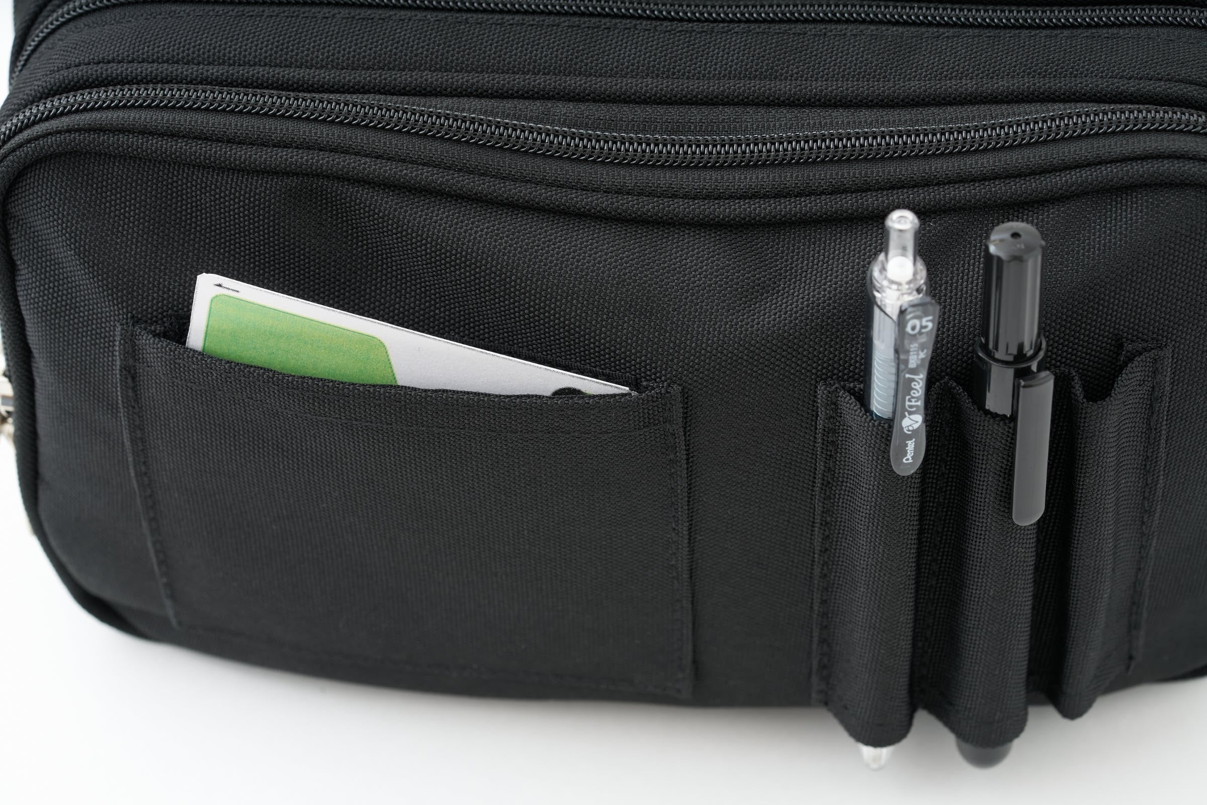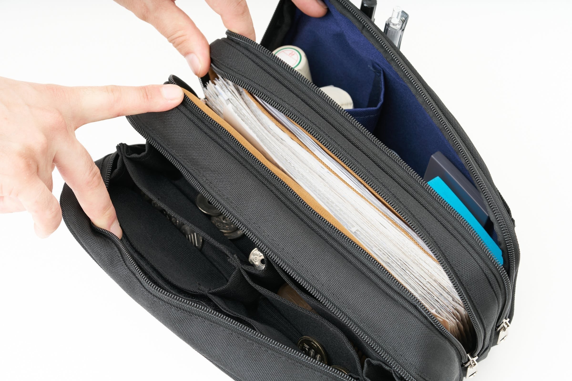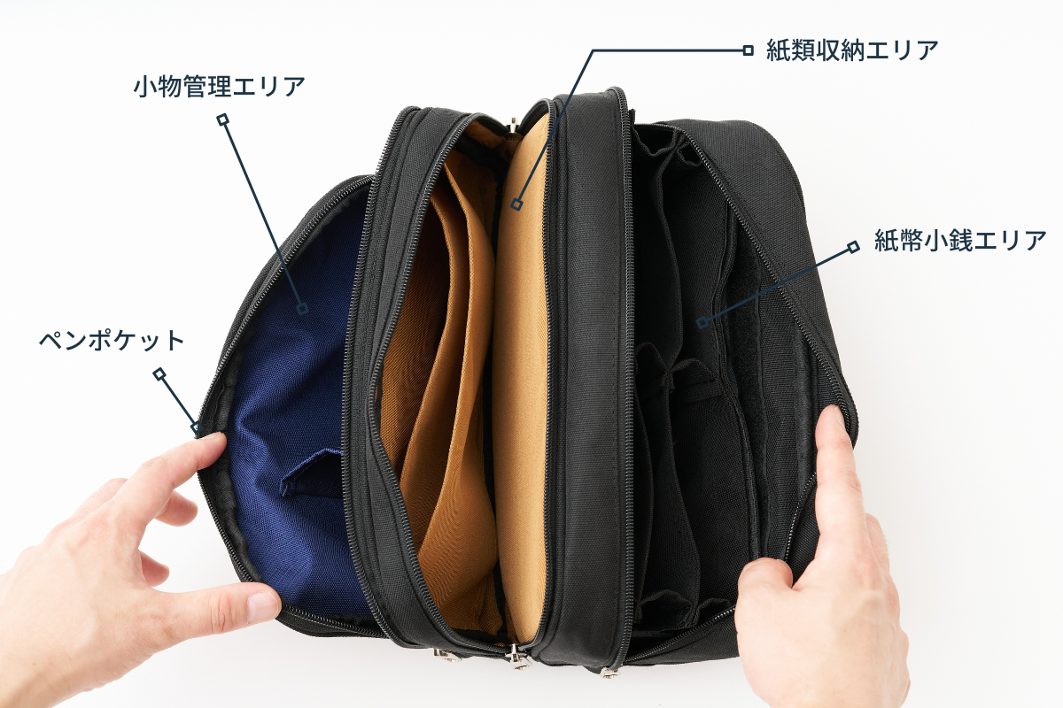 内部は「小物管理エリア」「紙類収納エリア」「紙幣小銭エリア」の3つのスペースに分かれており、外側には「ボールペン差し込みポケット」や「マジックテープ式のICカードポケット」などを用意しています。