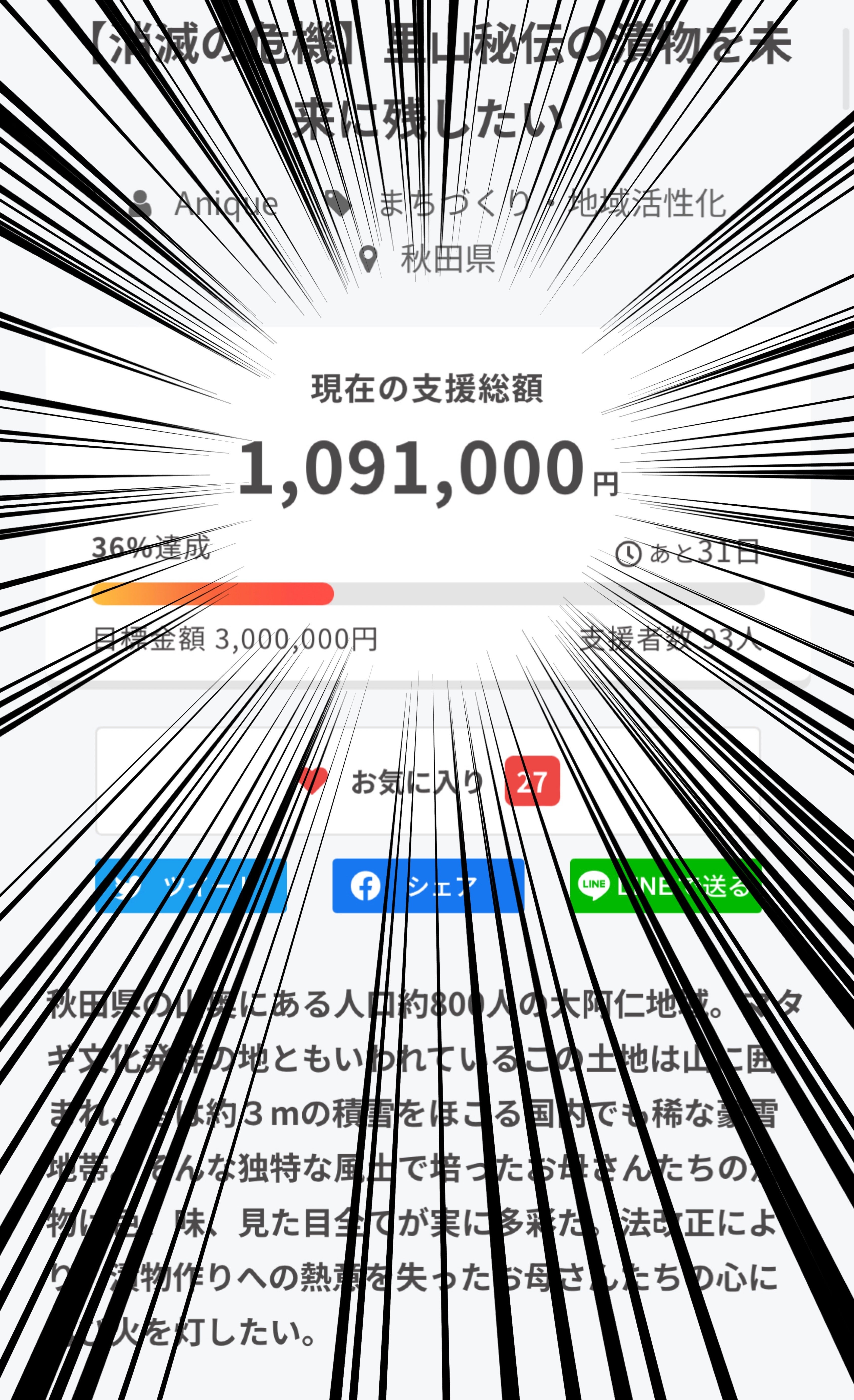 遂に皆様のご支援額が100万円を突破しました。「やっと一区切り!!!」とホッとしている一方で、不安も。佐々木です。今まで生きてきて滅多に見ることのなかった数字を目の当たりにして、ドキドキしています。しかし、campfireの記事を見ていると「最初の1週間は支援が集まりやすい」と言われているそうです。実際、1日あたりの支援額も日に日に減少してきています。めちゃくちゃ不安です。できることをコツコツやっていくしかないのですが、それでも「達成できなかったら・・・」という不安が頭にこびりついて離れません。「やっぱりな」とか「ほらみろ」とか「だから言ったじゃん」とか達成できなかった時のネガティブな言葉が私の周りを駆け巡っています。達成時は「どうだ!秋田の山奥でもこれだけのポテンシャルがあるんだぞ!!!」とみなさんと一緒に叫びたいです。毎日たくさんのご支援ありがとうございます。引き続き応援のほど何卒よろしくお願いいたします。