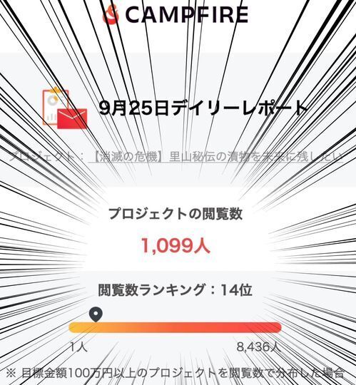 現在9/26(日) 22時ちょっと前。おばんです。佐々木です。朝起きたら画像のようなニュースが飛び込んできました。たくさんのプロジェクトが掲載されているcampfire内で閲覧ランキング14位を記録したそうです。興奮のあまり一気に目が覚めました。秋田の超小さな集落が、昨日全国に名乗りを上げたのです。一瞬だけかもしれないけれど。これがどれだけすごいことか。そして、どれだけたくさんの人に応援されているか。正直。地元のじいちゃんばあちゃんは自分の持っている知識や技術に誇りを持てずにいます。(たぶん)それは、彼らにとってはそれが当たり前のことで人に見せたり、自慢するようなものではないと感じているから。それなのに、ちょっとあいさつしただけでも「これもってかねが?」「がっこもってげ」などめちゃくちゃよくしてくれるんです。そういったささいな食べ物のやり取りが、結構、楽しい。明日、地域をいろいろと回る予定です。このニュースを片手にみんなどんな顔をしてくれるのかドキドキしてます。仕掛け人側のサプライズパーティー直前のようなドキドキです。その報告は後日致します。みなさんのおかげで、この結果になりました。引き続き36日間のこの物語を楽しんでもらえたらうれしいです。シェア、応援の程何卒よろしくお願いいたします。ここまで読んでいただきありがとうございました。佐々木