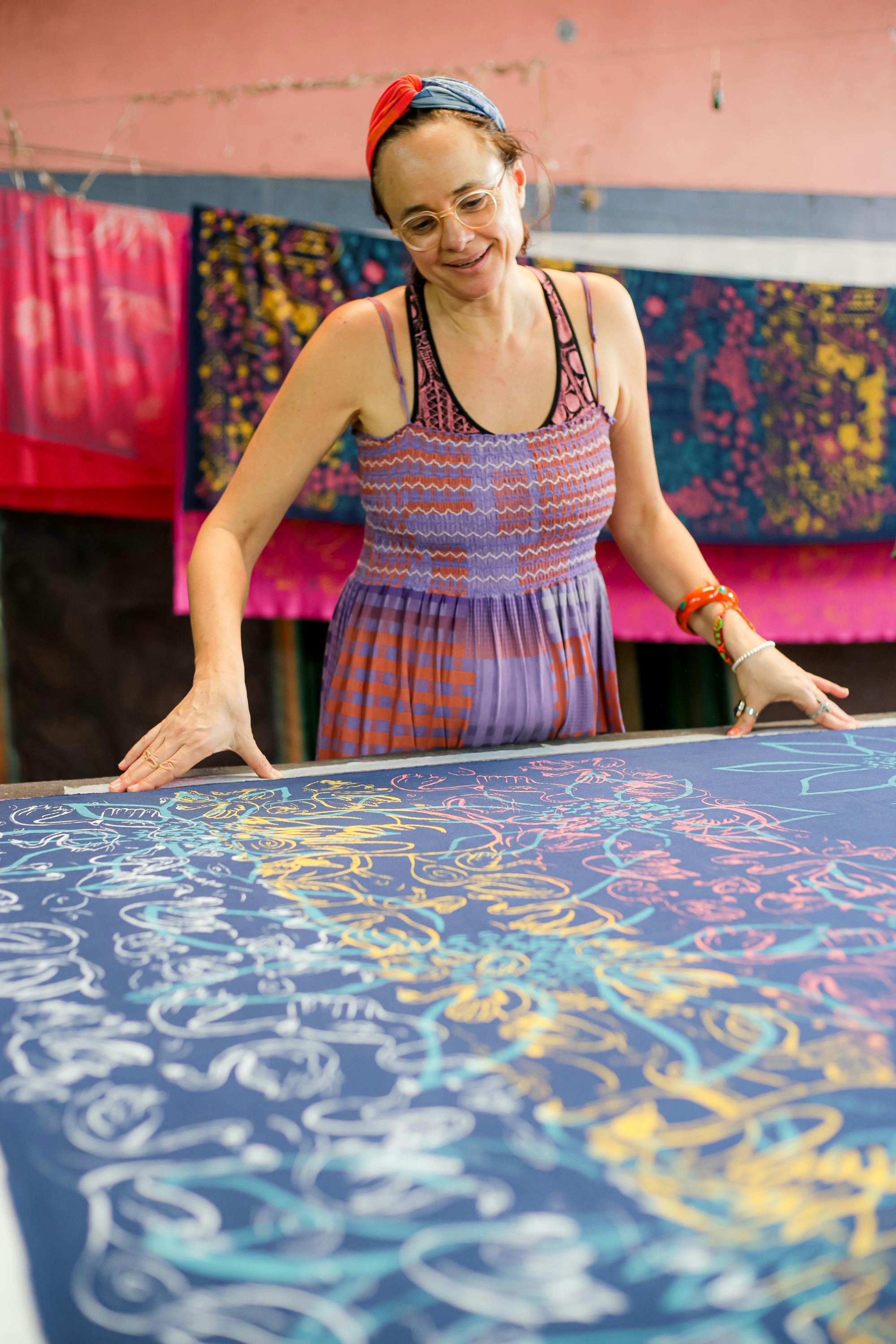 Juana de Arconの代表的なテキスタイルのモチーフであるニャンドゥティを並べて構想中のMariana。