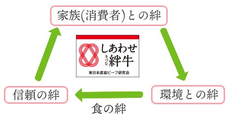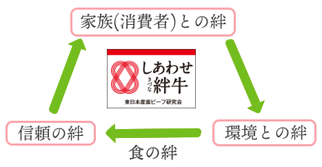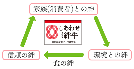 牧場で牛を生産してから食卓に届くまでに多くの過程があります。当研究会はブランド名に記載してあるとおり、「しあわせ」を食べていただき、食卓まで仕事に携わる方との絆が研究会の強みと感じておりますので農場・飼料・食肉加工・小売り・スーパーから消費者へ絆の連鎖を作ってまいりました。愛情と時間を注ぎ込んで手塩にかけて育てた牛だからこそ、きちんとした形でおいしい牛肉を食べていただきたいと思い生産者自ら皆様に直接食べて欲しいと挑戦させていただきました。