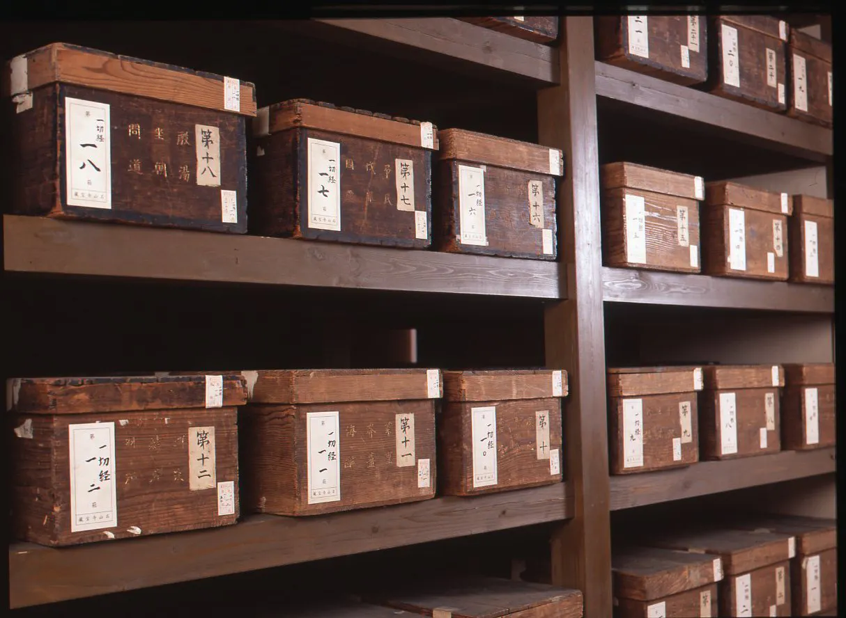 文書を納めた木箱が並ぶ収蔵庫の一室:薫聖教(国宝、73巻1帖1巻)をはじめ石山寺一切経(4644帖199巻)および校倉聖教(1926点)(ともに重要文化財)、ほかに深密蔵聖教、寺誌類等100箱以上が収蔵されています。
