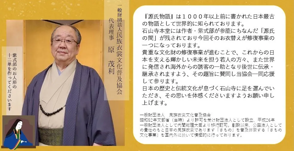 「源氏の間」紫式部のお衣400万円、侍女のお衣300万円、土佐光起筆「紫式部図」修復230万円