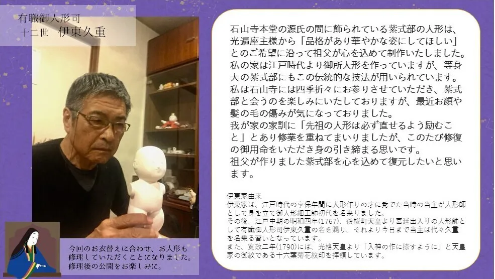 大切に守られてきたこの作品も、紫式部のお顔や着物に傷などが目立ち、修理をしなくてはならない時期に差し掛かっています。