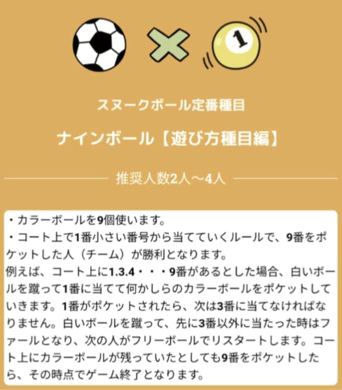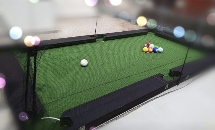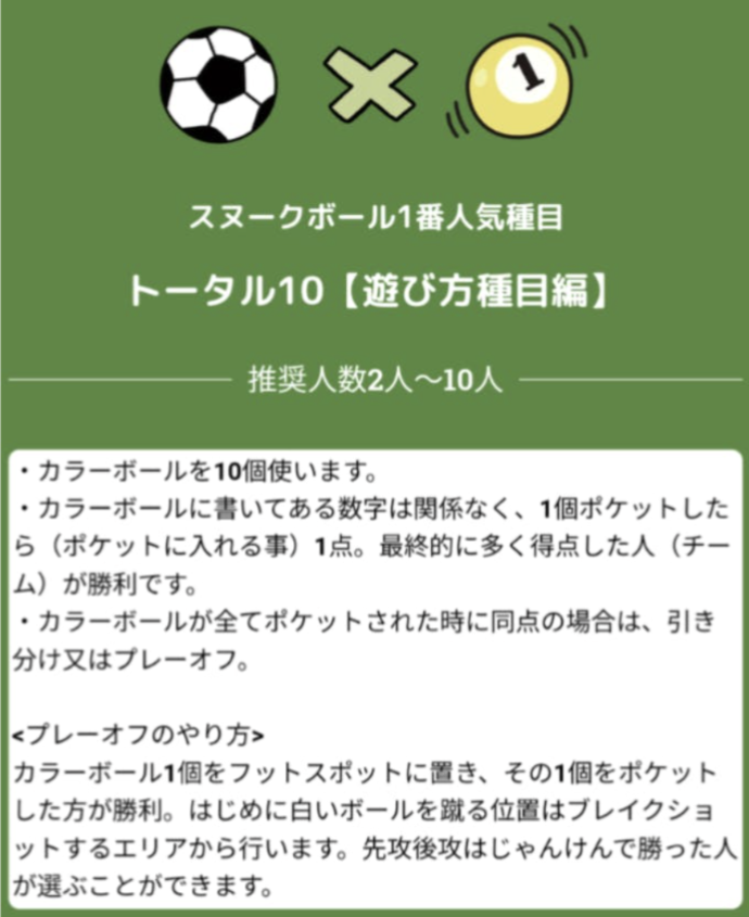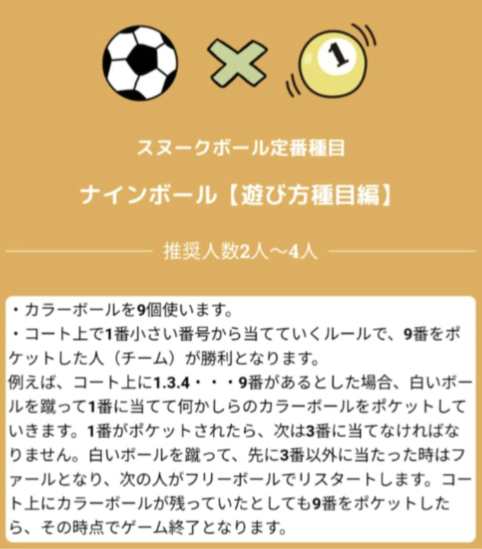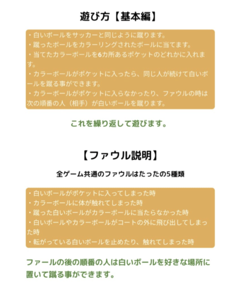 ビリヤード台を大きくしたコートに人が入ってビリヤードと同じルールで、白いボールを蹴り、色付きボールに当てて、色付きボールを6ヶ所のポケットに入れるゲーム!