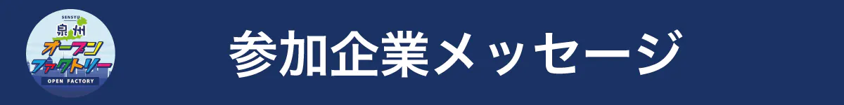 「泉州オープンファクトリー」は、普段あまり目にする機会のない、ものづくりの現場や技術を見ることができる体験型イベントで、生活や地域を支える“商品・技術・人”に直接触れてもらい、泉州の中小企業の魅力を感じてもらうプロジェクトです。泉州を盛り上げるため、ぜひ応援・ご協力よろしくお願いします!