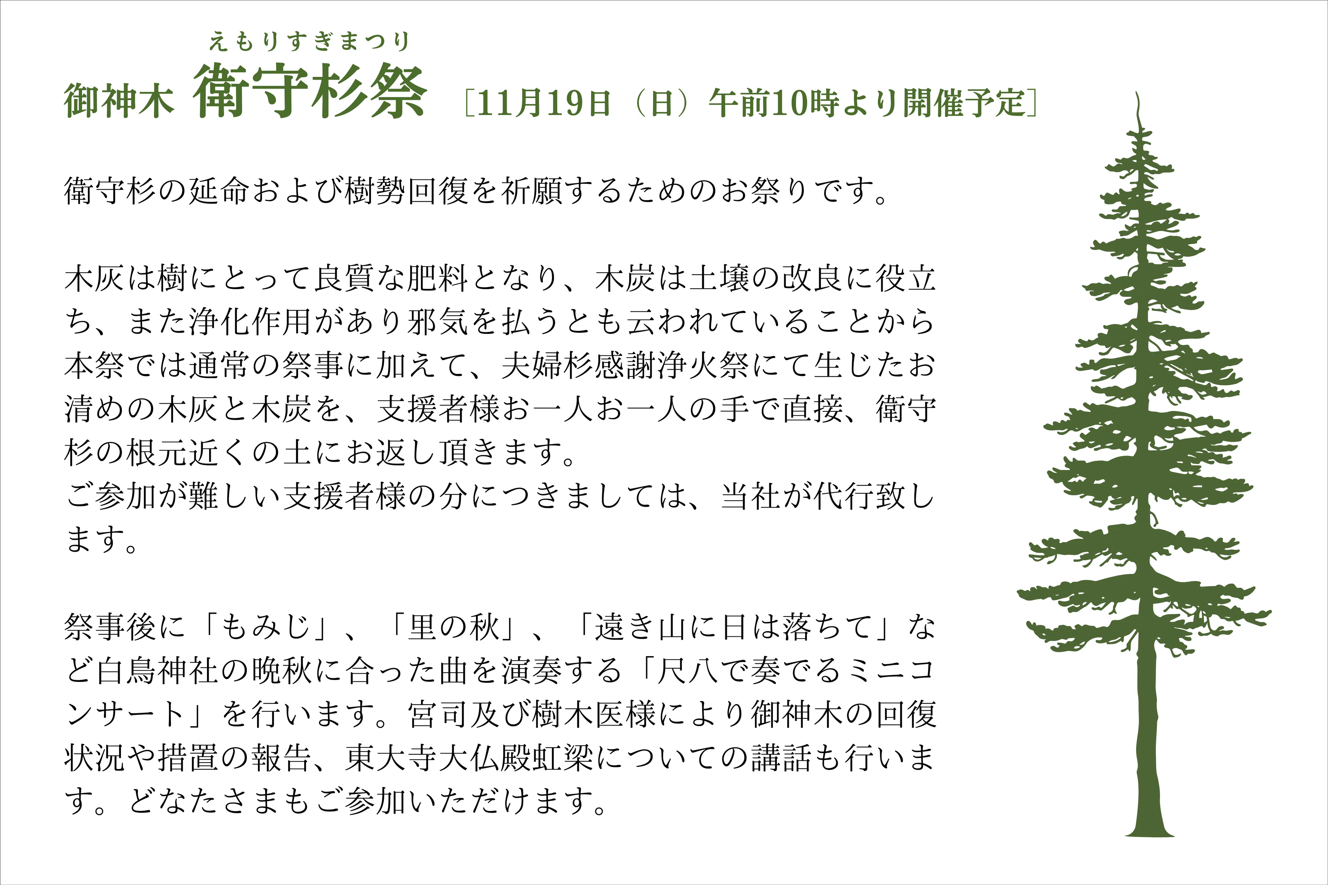 『夫婦杉感謝浄火祭』と『御神木 衛守杉祭』の二つの祭儀を執り行います。どなたでもご参列可能です。