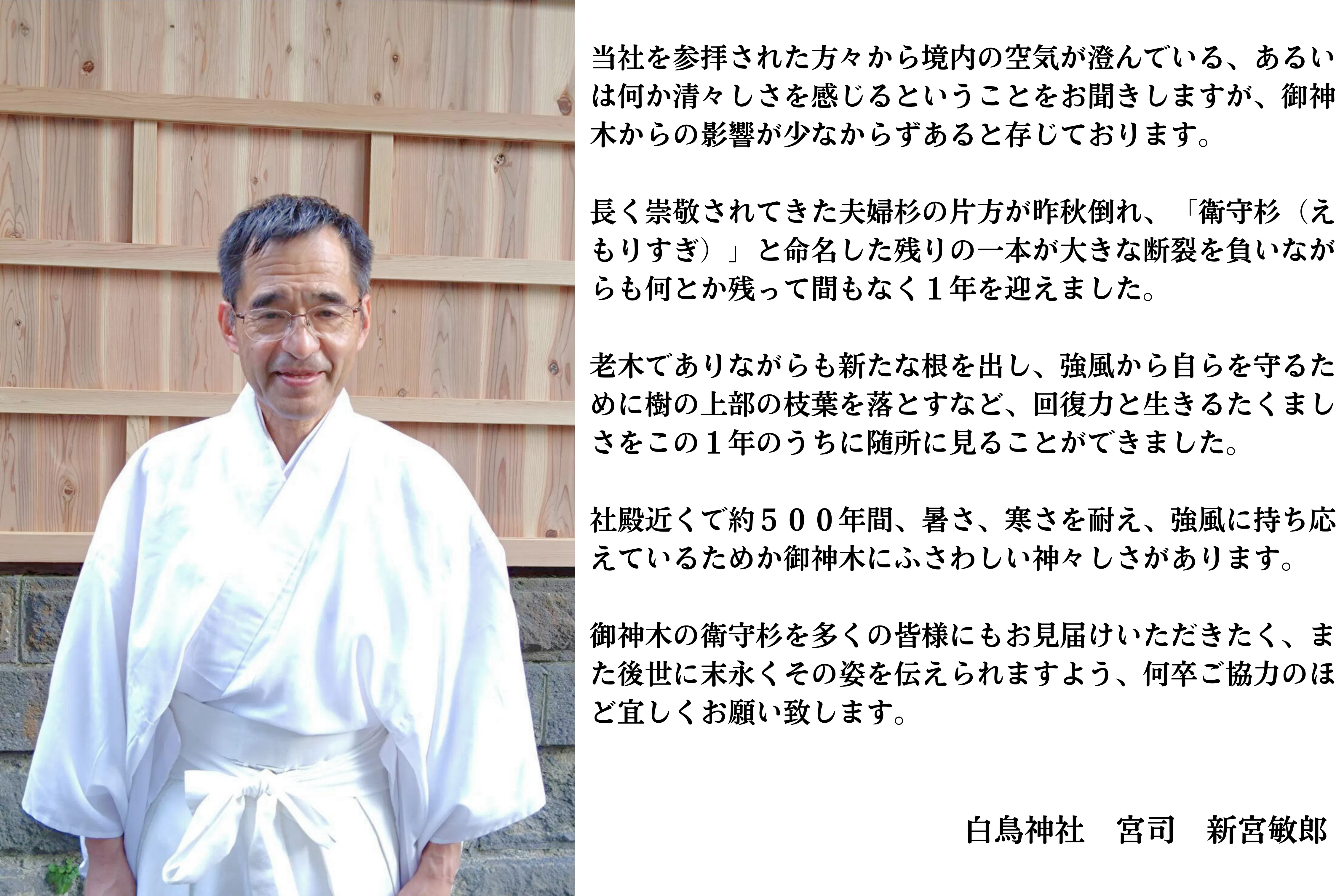 “「夫婦」と呼ばれた神木の片側が、倒伏した後も同じ場所に逞しく佇み続けるこの姿は、パートナーや大切な人を無くされた方々にとっても心の支え、心の拠り所にふさわしいので長く守ってほしい”