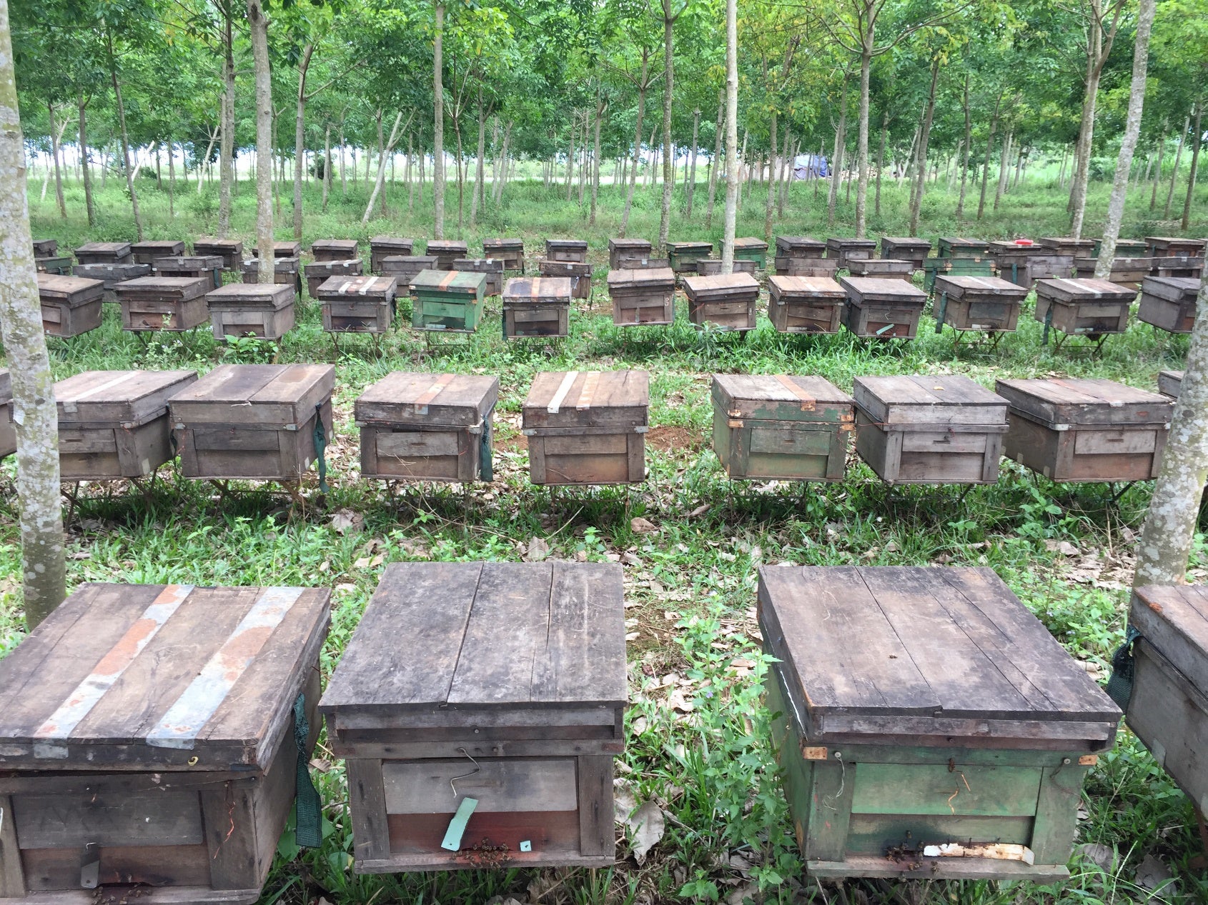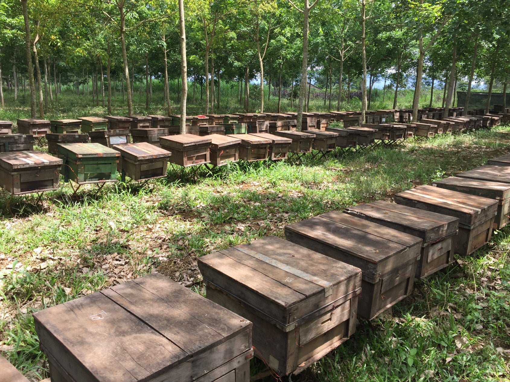 ゴムは、古い葉が落ちた後若葉が生え、45日後、葉液が出ます。気候が暑ければ暑いほど、乾けば乾くほど多くの液が出て、その液を吸った蜂から蜂蜜を採取しています。