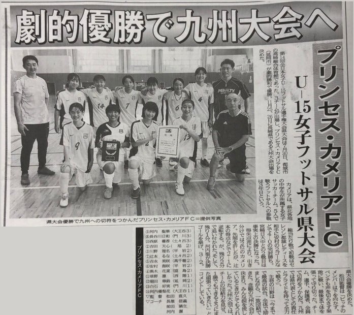 プリンセスカメリアFC (PRINCESS CAMELLIA FC)がこの度U-15女子フットサル宮崎県大会において念願の初優勝をすることが出来ました。保護者の皆様や地域の皆様の応援をいただいたからこその優勝で大変感謝しています。