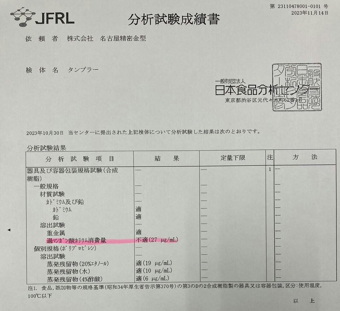結果は、1項目「不適」!過マンガン…?酢酸カリウム…?目が回りますね(笑)。