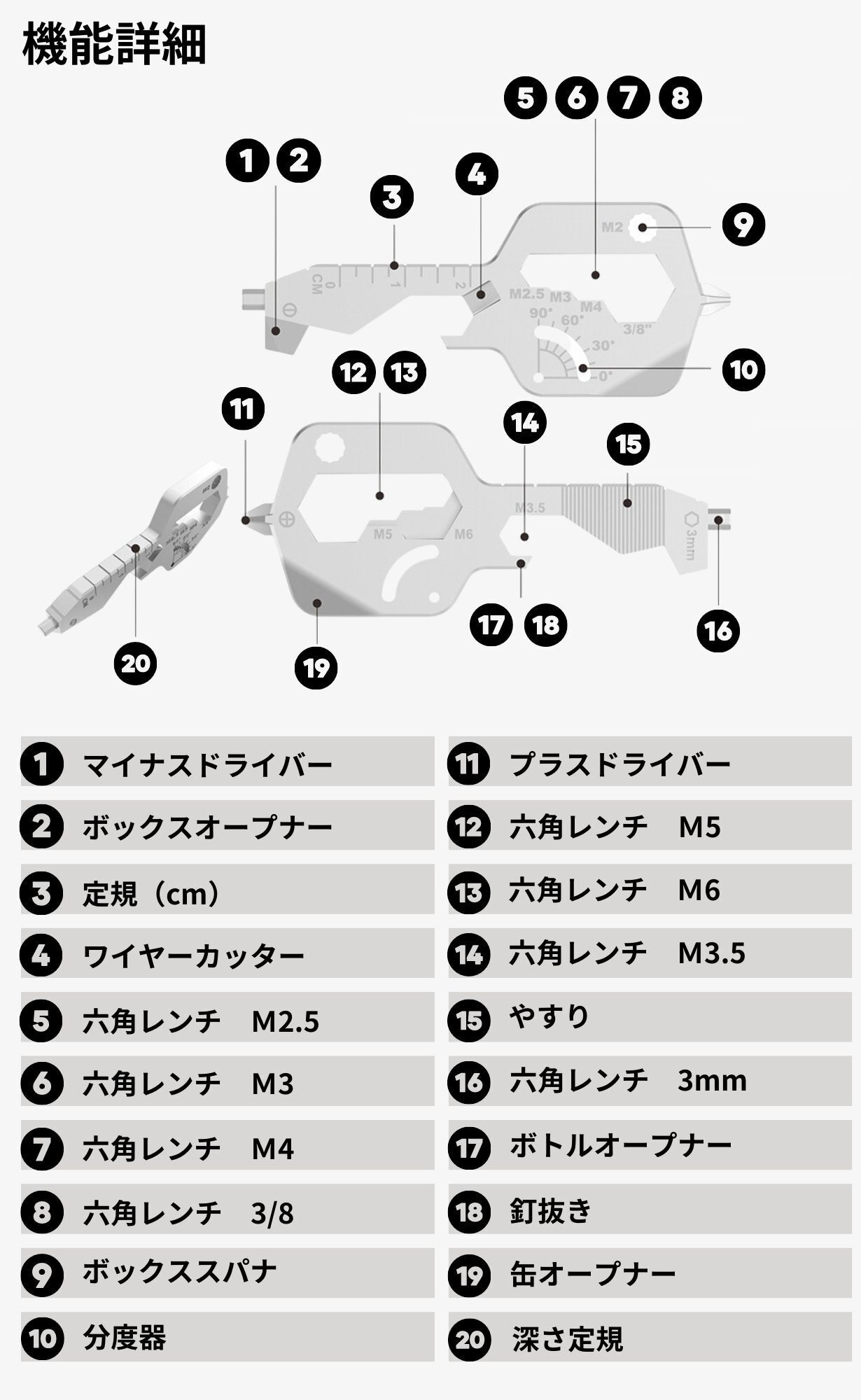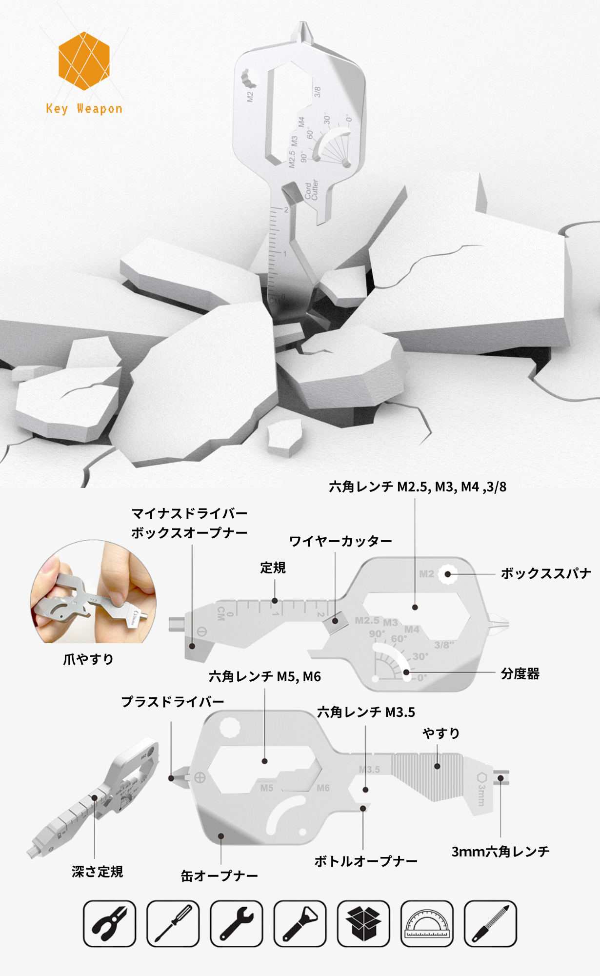 最新の製品である「Key Weapon」は、キー型のコンパクトなデザインに加え、20種類の機能を搭載し様々なシーンで活躍することができます。 また、耐久性の高いステンレス鋼を採用しておりますのでキーホルダーやバッグに付けて持ち運ぶことができ、いつでもどこでも使いたいときに利用できる便利なアイテムです。