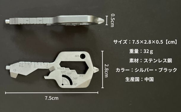 A:長さ7.5cm・幅2.8cm・厚み0.5cm 重量32gです。普通の鍵より少し大きい感じです。他の鍵と一緒にキーリングして持ち運びが出来て大変便利です。