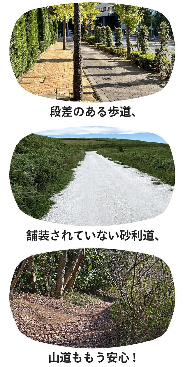 凸凹のある悪路、舗装されていない山道・砂利道を走るMTBにもオススメです。