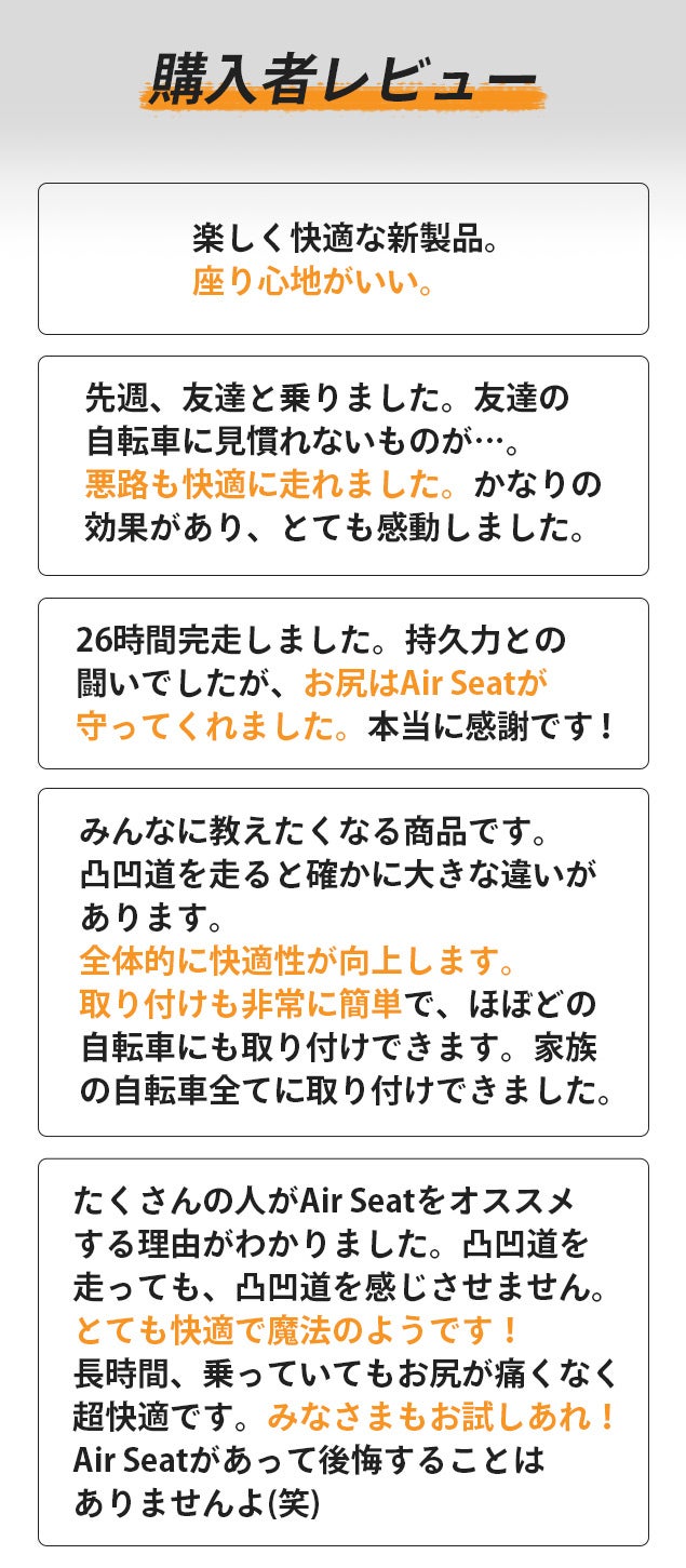 私たちは、Air Seatが自転車の乗り心地を革命的に進化させた!と自負しています。