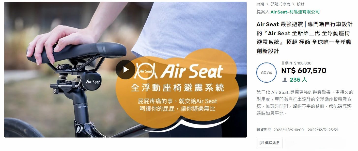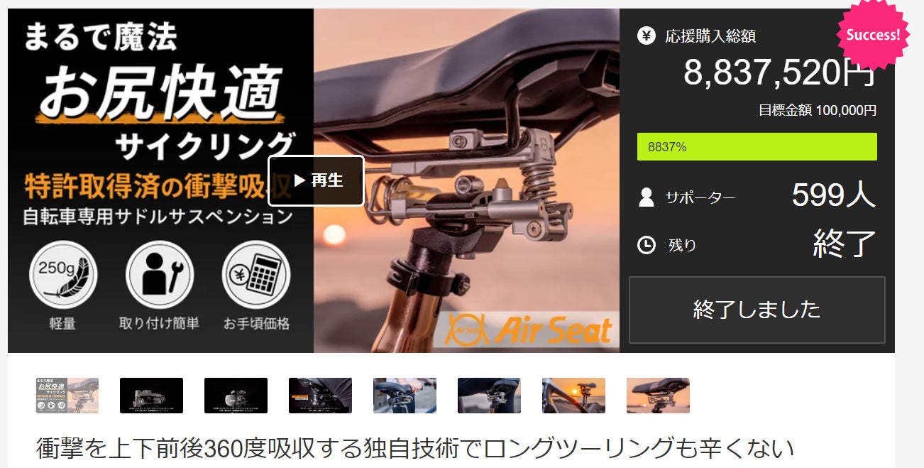 Air Seatは過去の日本、台湾でのクラウドファンディングサイトで総額1163万円(9/9現在1台湾ドル=4.6040円で換算)、834名のみなさまから支援いただいた注目のアイテムとなりました!