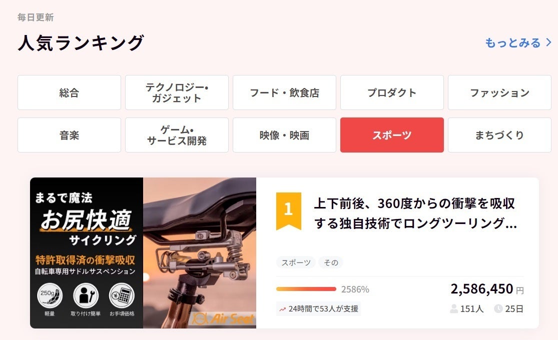 このたびはAir Seatのプロジェクトにご支援いただきましてありがとうございます!お陰様で、スポーツ部門ランキング、【第1位】を獲得することができました!!総合でも現在、第5位にランクインしています!!一人でも多くの方に「Air Seat」をお届けできるよう、スタッフ一同頑張ってまいりますので、SNSなどの拡散にご協力いただけると幸いです。どうぞよろしくお願いいたします。みなさまの温かいご支援をお待ちしております!Air Seatチームスタッフ一同