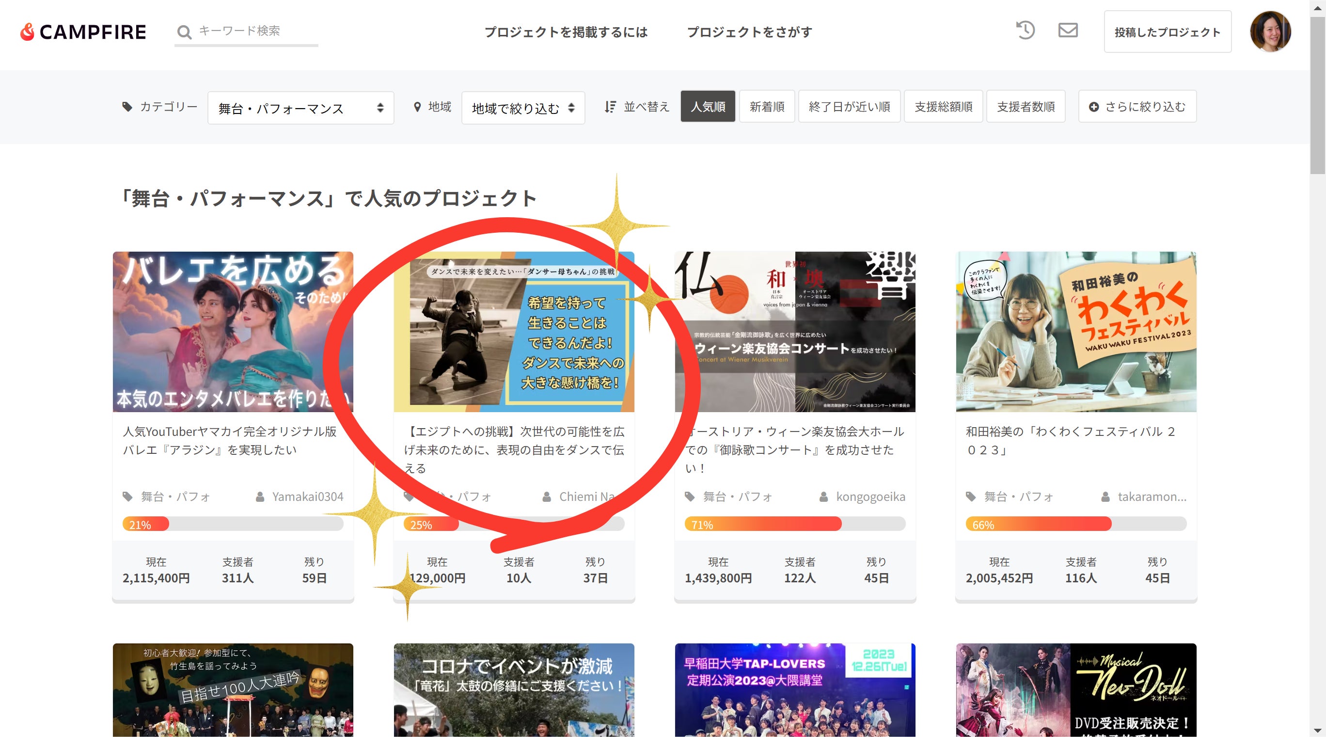そして、CAMPFIRE内のプロジェクトのなかで「公演・パフォーマンス」部門において話題のプロジェクトとして掲載されております!
